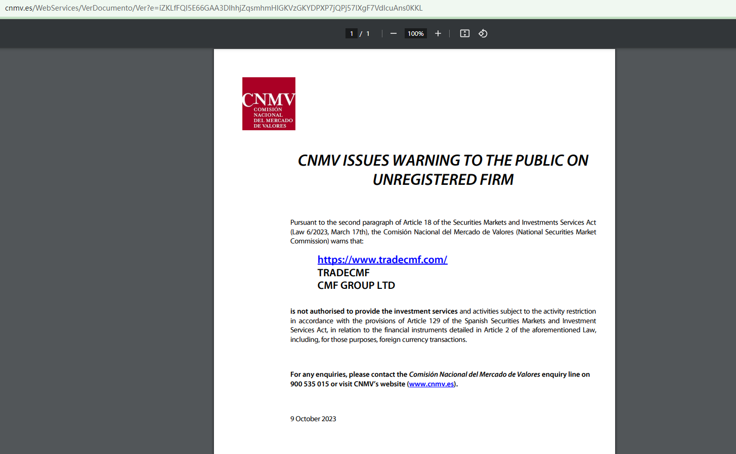 More importantly, the Comisión Nacional del Mercado de Valores (CNMV) has added TRADECMF to its warning list for providing investment services without authorization.