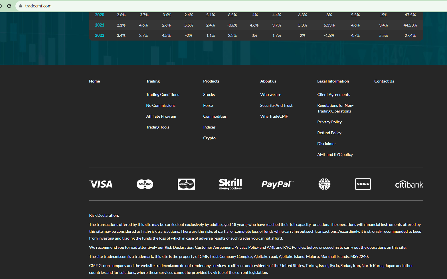 TRADECMF claims to be operated by CMF Group LTD, a company registered with the Marshall Islands Registry (IRI) under number 92240.