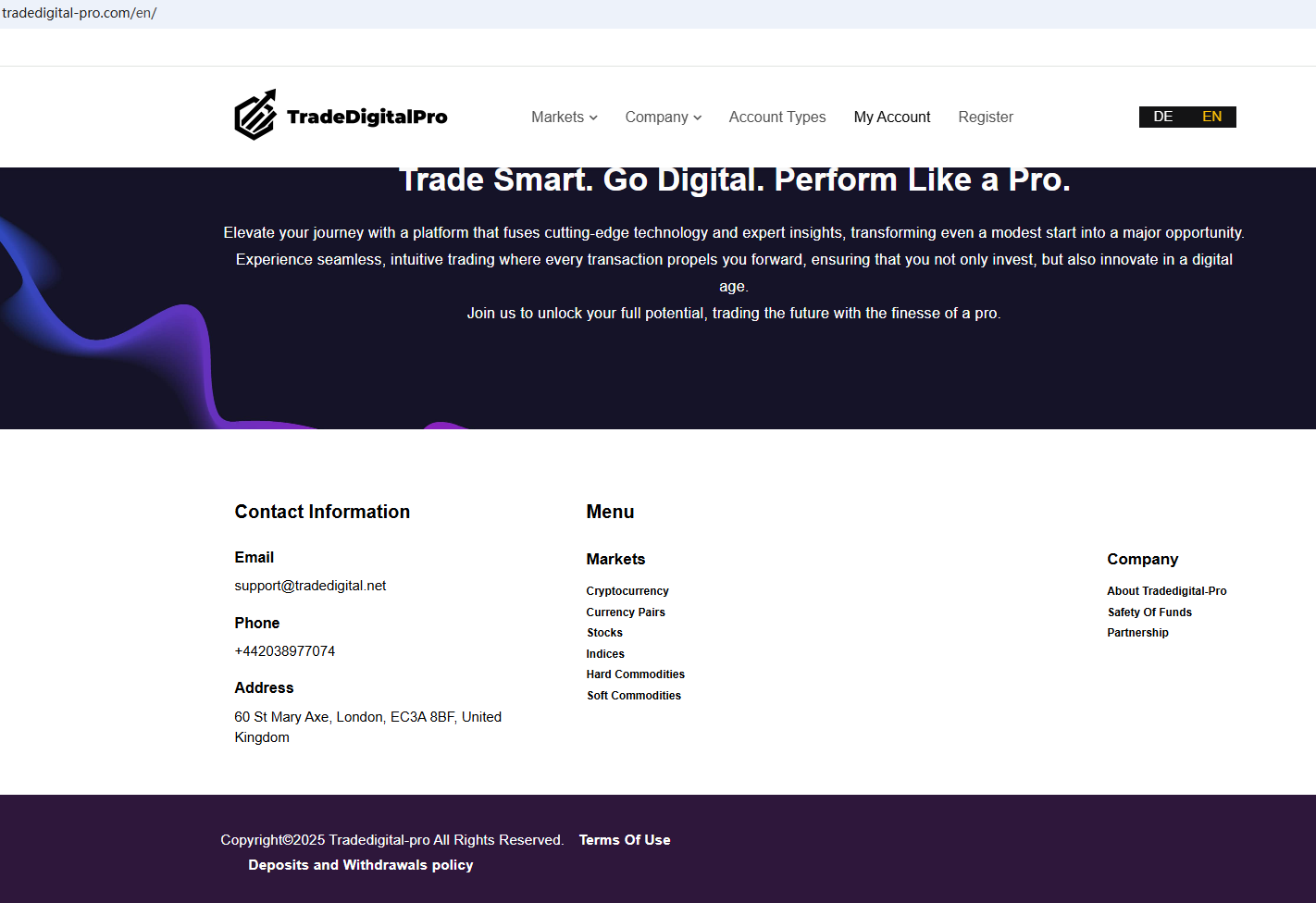 According to its website, it is located in the UK. Upon investigation, no matching information was found in the Financial Conduct Authority (FCA). In addition, the Netherlands Authority For the Financial Markets (AFM) issued a warning against Tradedigital pro, believing this company might be providing financial services or products without proper authorization.