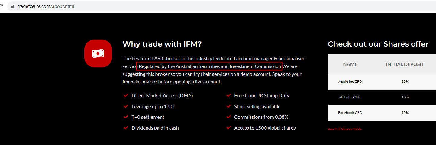 Tradefxelite also claims to be regulated by Australian Securities and Investment Commission (ASIC), however we found no matching results on ASIC. It's a red flag.