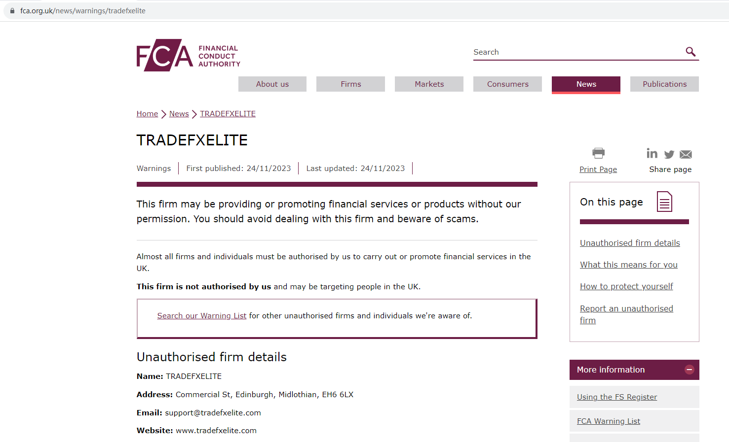 On 24 November 2023, the United Kingdom Financial Conduct Authority (UK FCA) issued a warning that Tradefxelite was providing financial services or products in the UK without authorisation. You may visit: https://www.fca.org.uk/news/warnings/tradefxelite