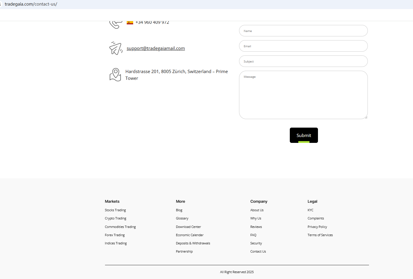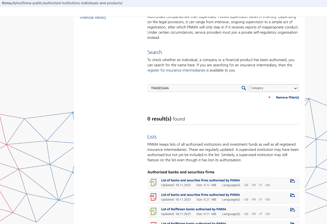 According to its website, it claims its office is located in Switzerland. However, a search yielded no matching information in the Swiss Financial Market Supervisory Authority (FINMA). In addition, the National Securities Market Commission (CNMV) issued a warning against TRADEGAIA, as it believed this company might be providing financial services or products without proper authorization.