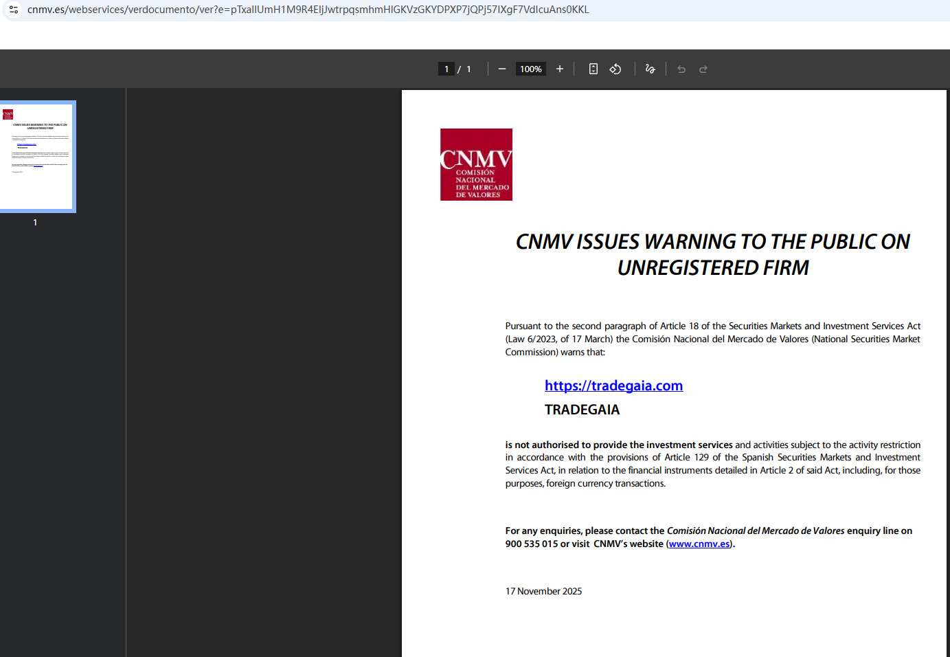 On Nov 17, 2025, the National Securities Market Commission (CNMV) issued a warning against TRADEGAIA, believing this company might be providing financial services or products without proper authorization. https://www.cnmv.es/webservices/verdocumento/ver?e=pTxalIUmH1M9R4EIjJwtrpqsmhmHlGKVzGKYDPXP7jQPj57IXgF7VdIcuAns0KKL