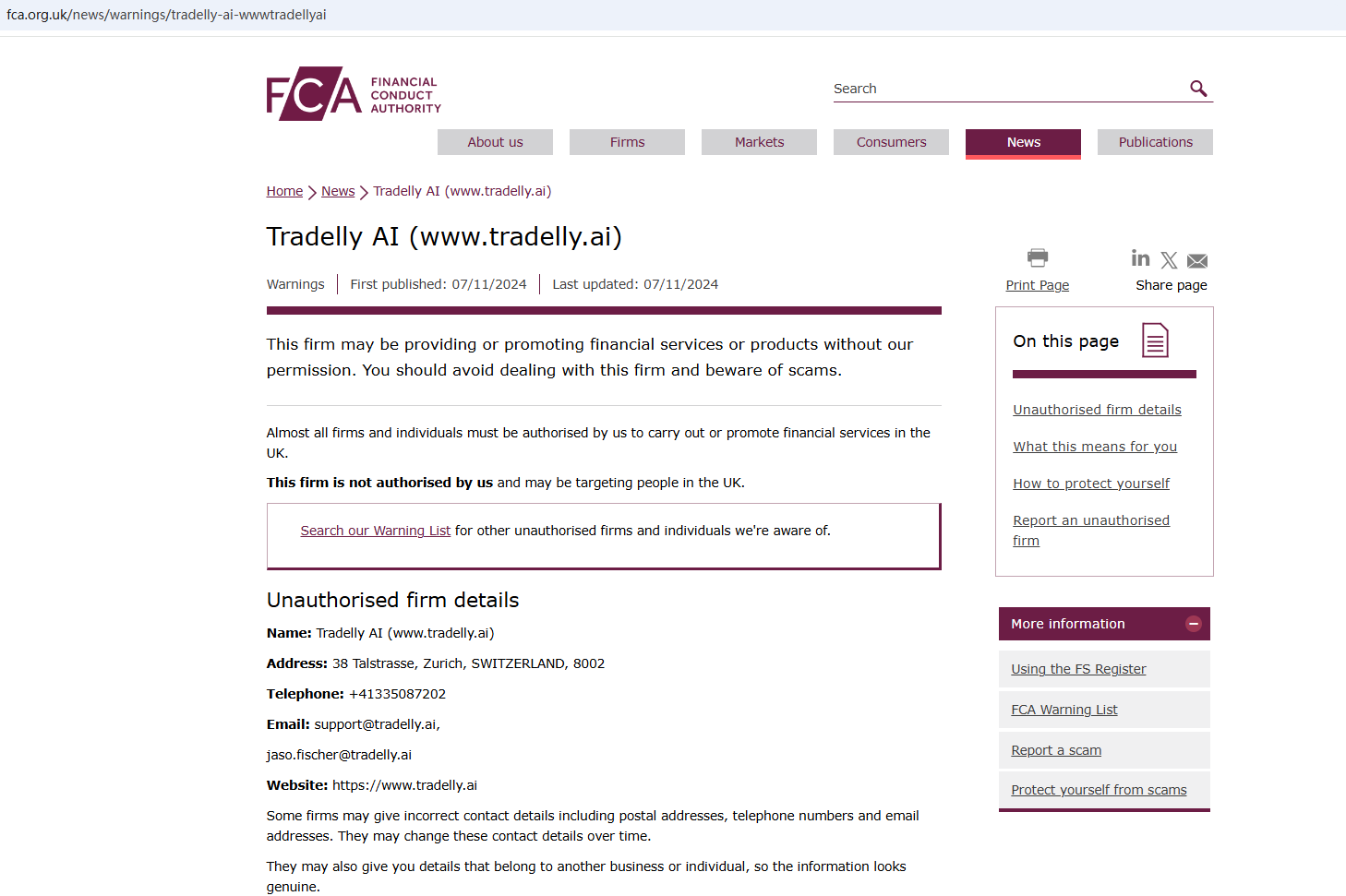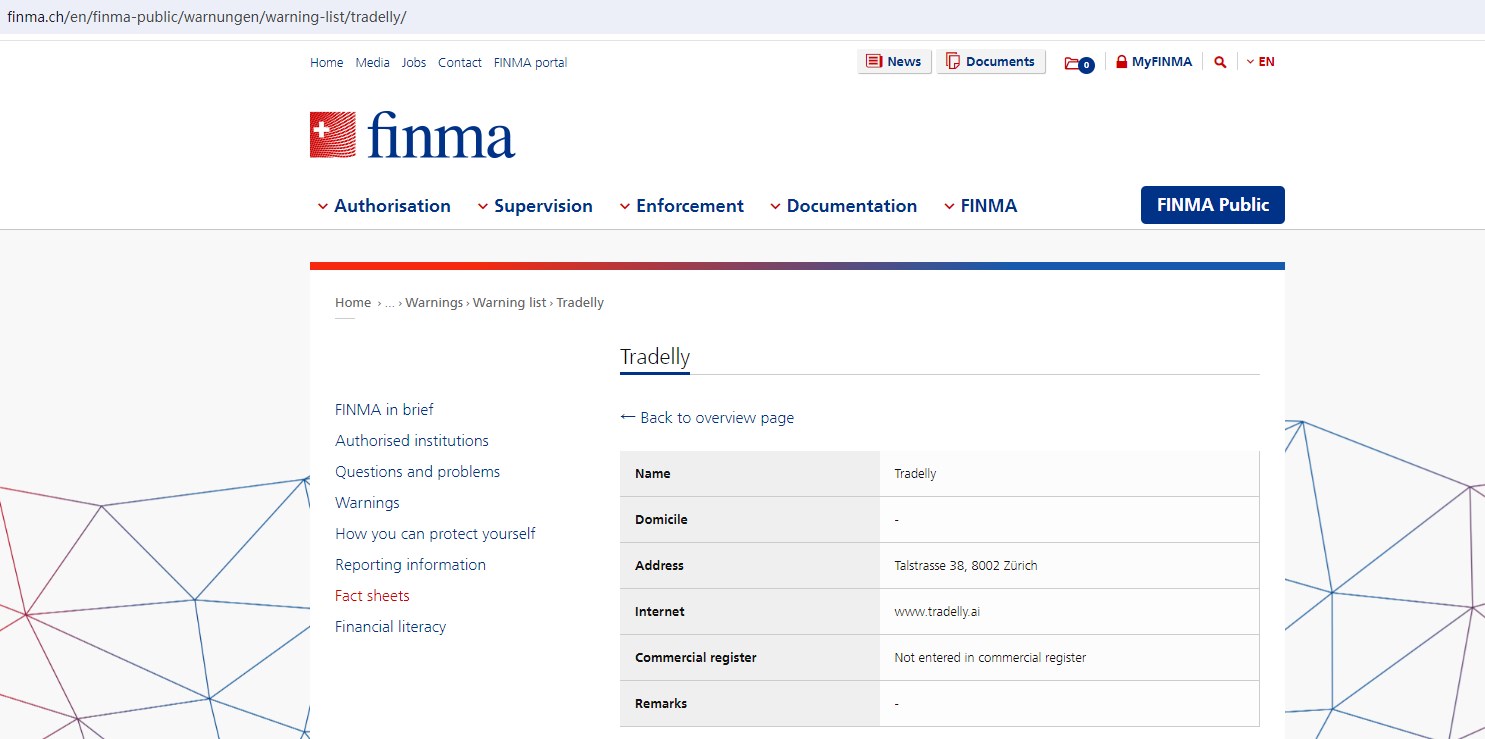 And the FINMA issued a warning against Tradelly.Ai, stating this company might be providing financial services or products without authorization.