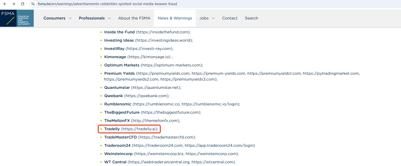 On 15 November 2024, The Financial Services and Markets Authority (FSMA) issued a warning against Tradelly, believing this company might be providing financial services or products without authorisation in Belgium. You may visit: https://www.fsma.be/en/warnings/advertisements-celebrities-spotted-social-media-beware-fraud.