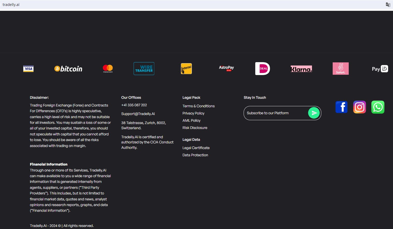 Tradelly (Tradelly.Ai) claims to be a broker located in Switzerland, which is certified and authorized by the CCA Conduct Authority, offering wide range of financial services, including Cryptocurrencies, Forex, Indices, Cryptocurrencies, Stock and more instruments in global markets. But you should know that there is no CCA Conduct Authority in Switzerland.