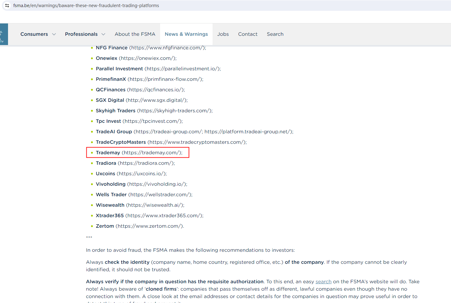 In addition, the Belgian Financial Services and Markets Authority (FSMA) added Trademay to its warning list as a fraudulent trading platform.