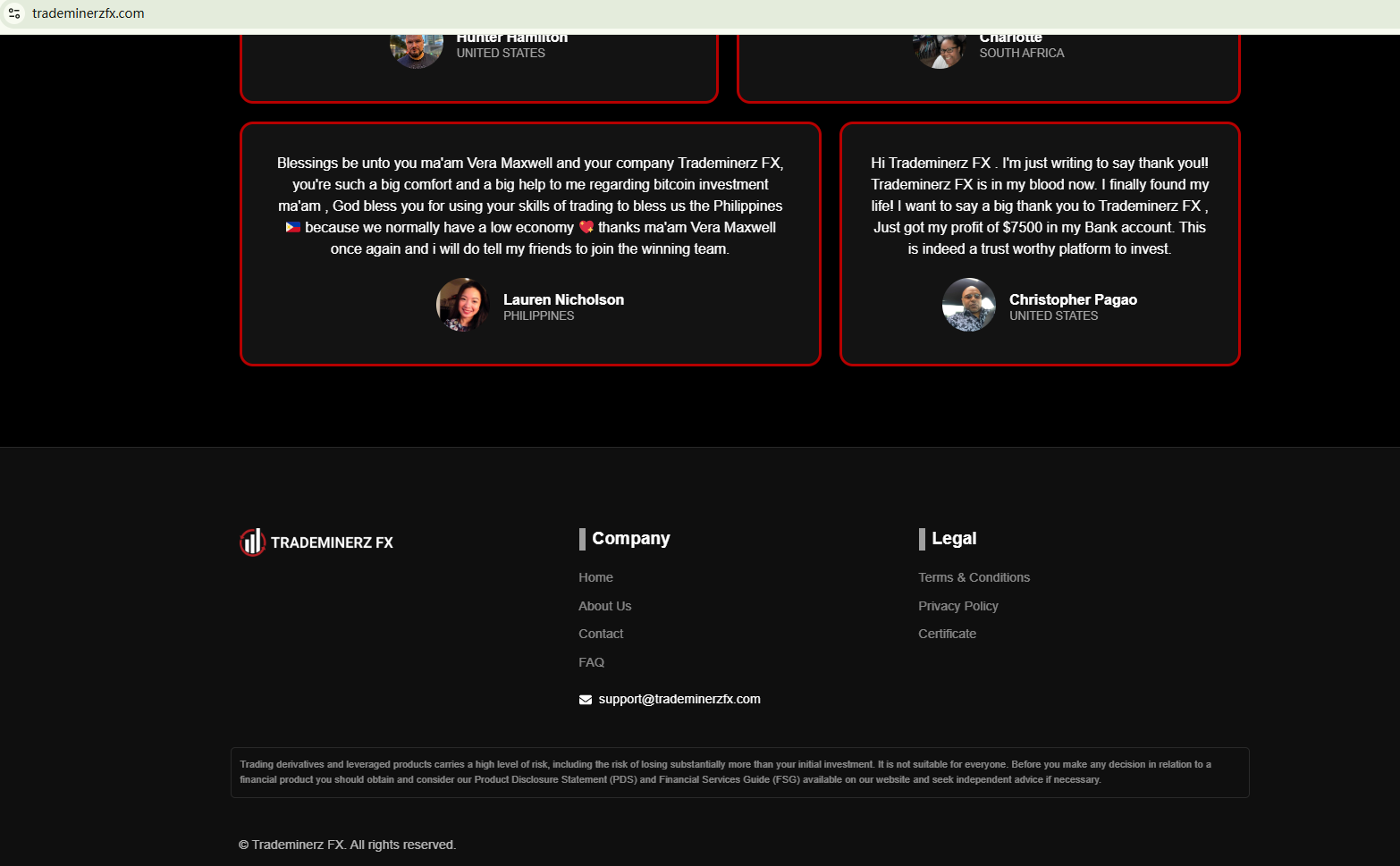 In essence, Trademinerz FX is not regulated by any governing body. Entrusting it with investors' funds is highly risky, as there are no legal protections in place to safeguard the funds. Trademinerz FX appears to be a scam.