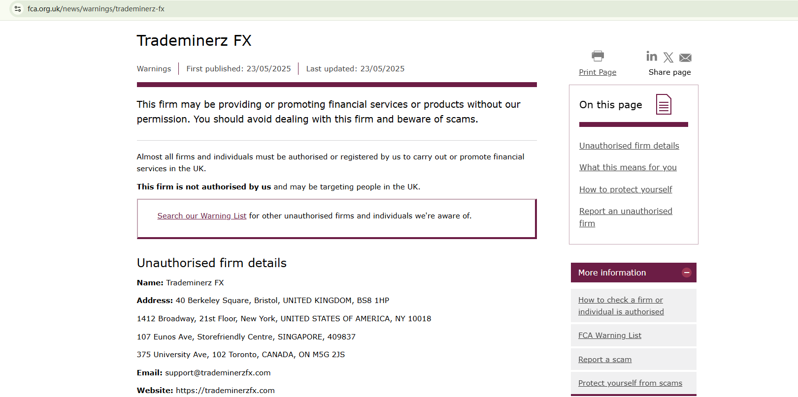 On May 23, 2025, the Financial Conduct Authority (FCA) issued a warning against Trademinerz FX, believing this company might be providing financial services or products without proper authorization in the UK. https://www.fca.org.uk/news/warnings/trademinerz-fx