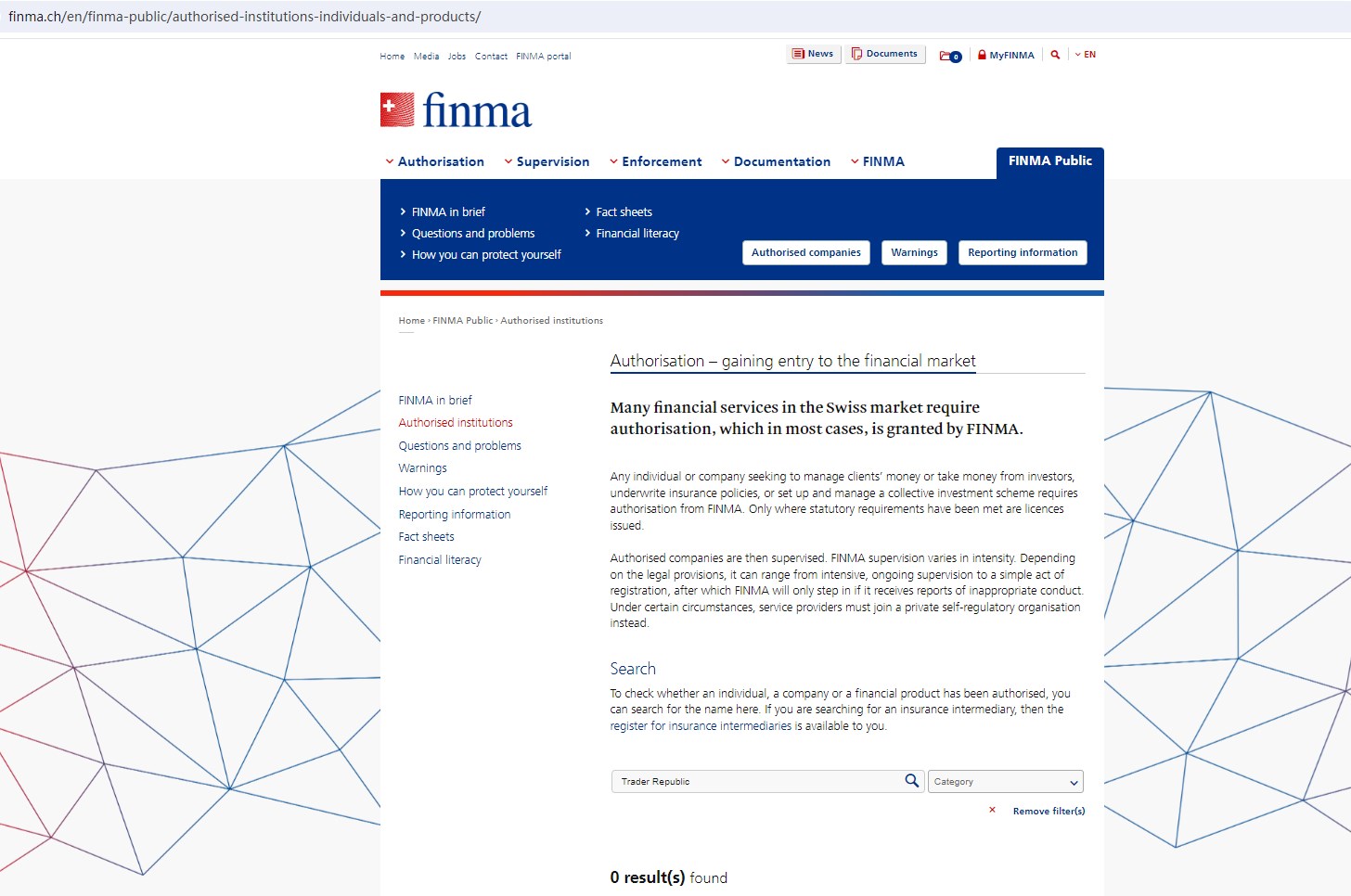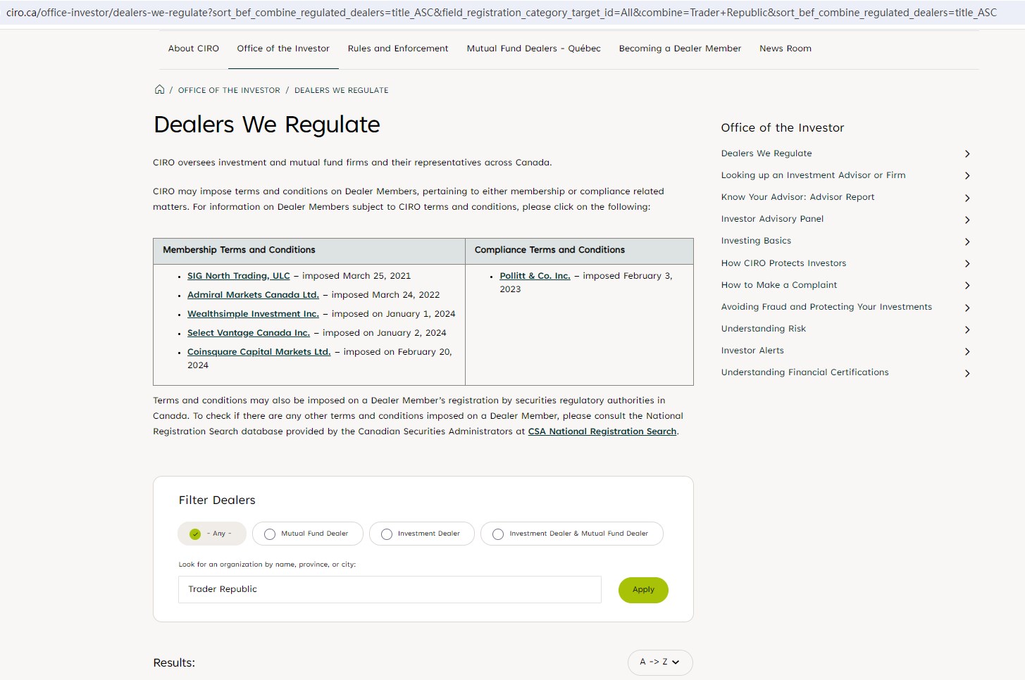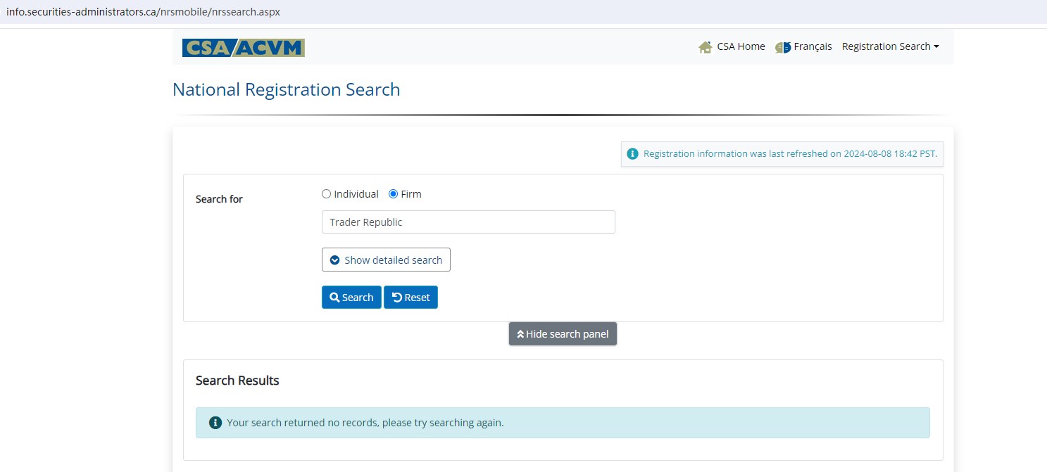 Upon investigation, Trader Republic is not regulated by the Swiss Financial Market Supervisory Authority (FINMA), the United Kingdom Financial Conduct Authority (FCA), the Investment Industry Regulatory Organization of Canada (IIROC) and The Canadian Securities Administrators (CSA).