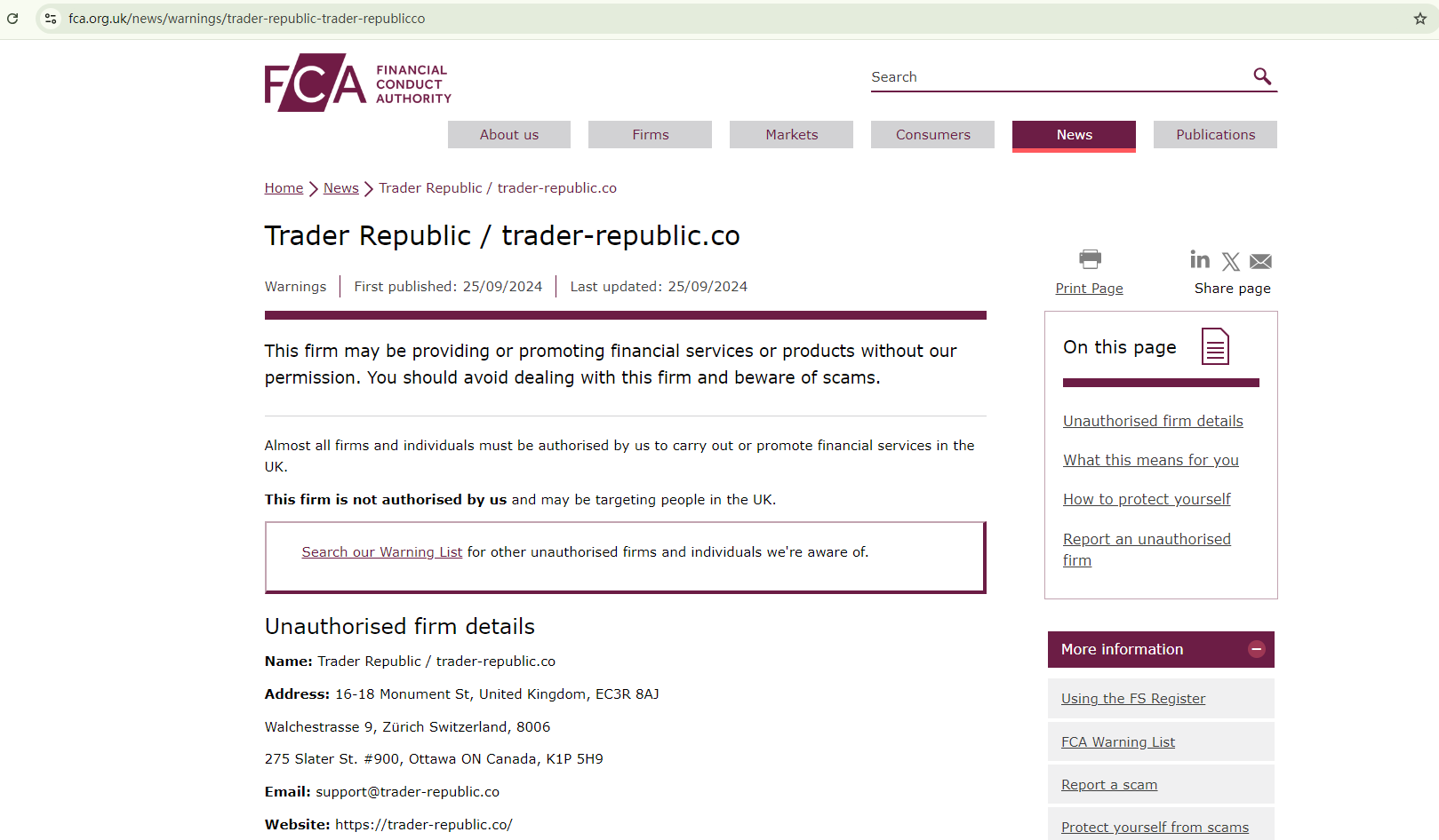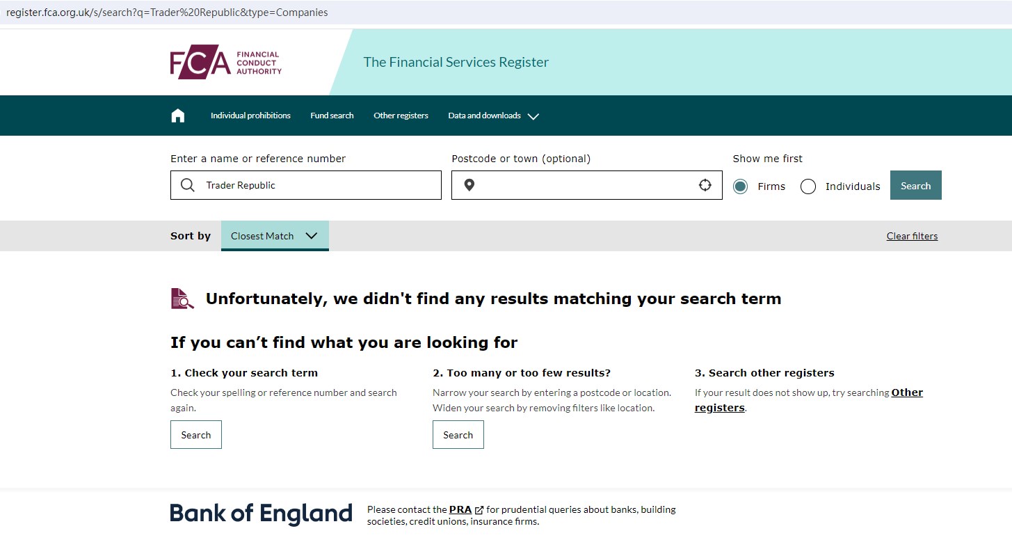 On September 25, 2024, the Financial Conduct Authority (FCA) issued a warning against Trader Republic for the lack of the required authorization. https://www.fca.org.uk/news/warnings/trader-republic-trader-republicco
