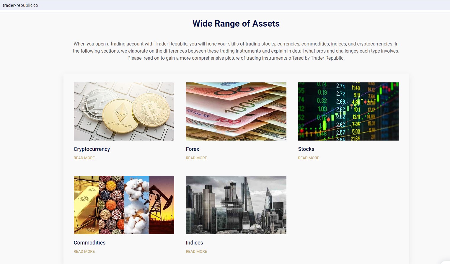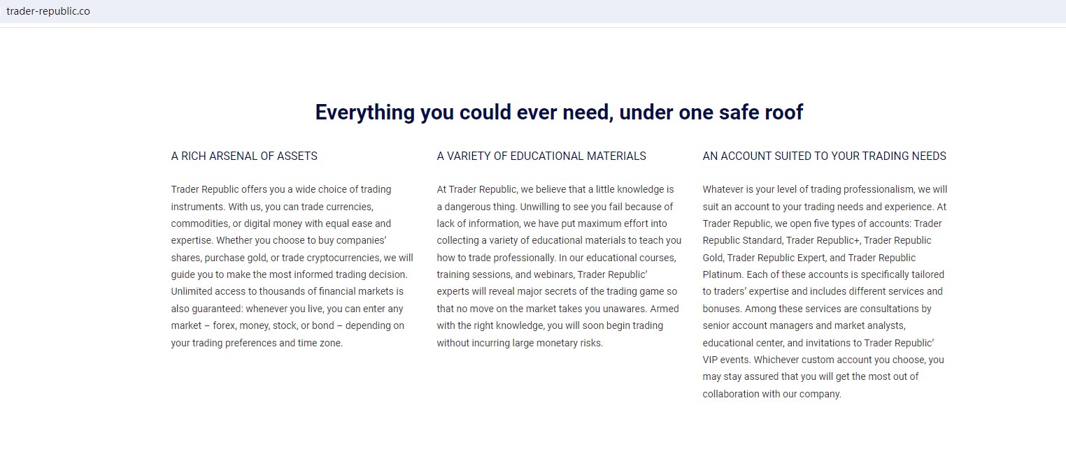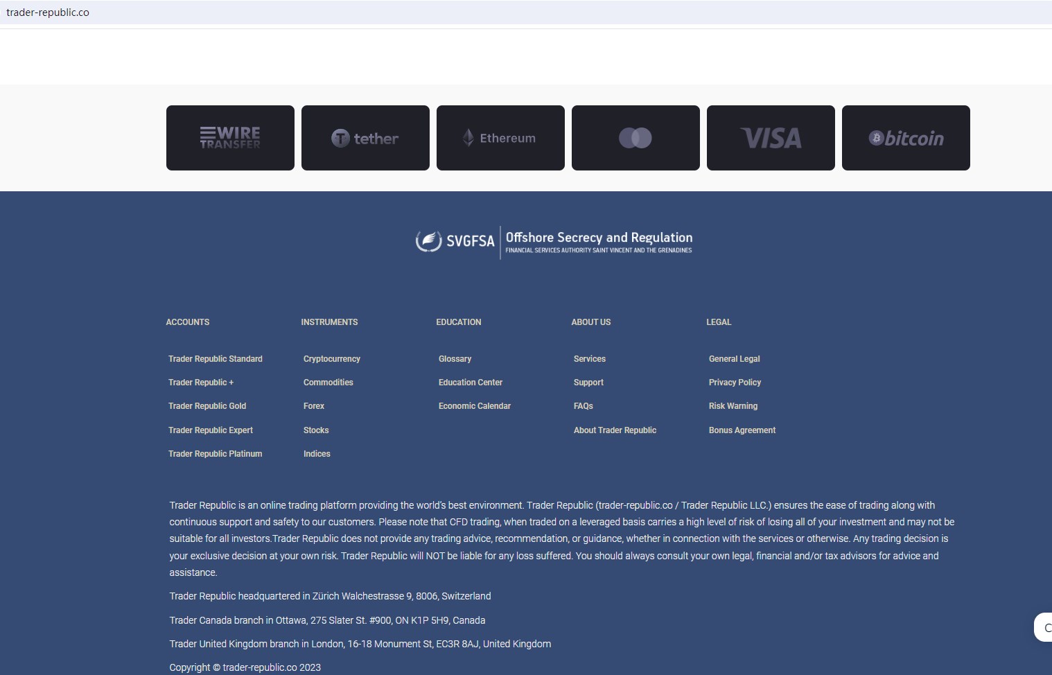Trader Republic (trader-republic.co / Trader Republic LLC.) claims to be an online trading platform headquartered in Switzerland together with offices in the UK and Canada, regulated by with SVG FSA, offering wide range of financial services, including Cryptocurrencies, Commodities, Forex, stocks, Indices and more instruments in global markets.