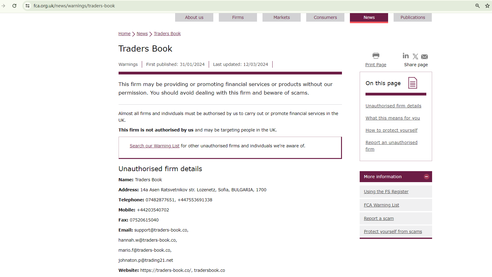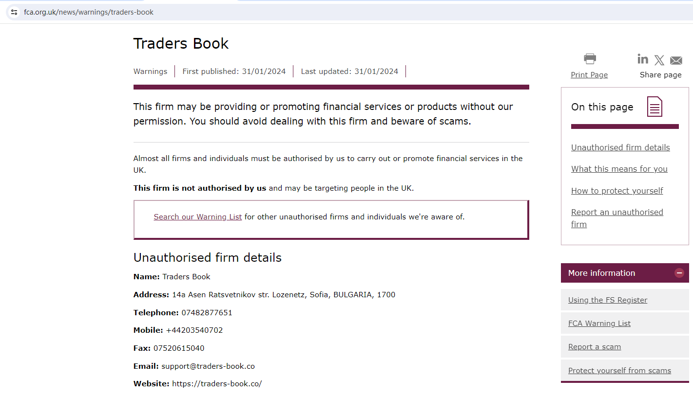 On 31 January 2024, the United Kingdom Financial Conduct Authority (UK FCA) issued a warning that Traders Book was providing financial services or products in the UK without authorisation. You may visit: https://www.fca.org.uk/news/warnings/traders-book