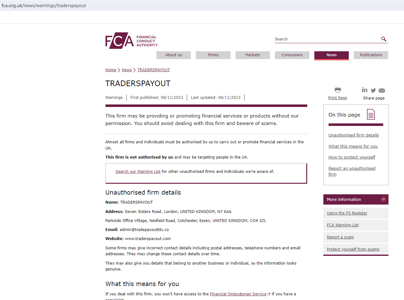 On 8 November 2023, the United Kingdom Financial Conduct Authority (UK FCA) issued a warning that TRADERSPAYOUT was providing financial services or products in the UK without authorisation. You may visit: https://www.fca.org.uk/news/warnings/traderspayout