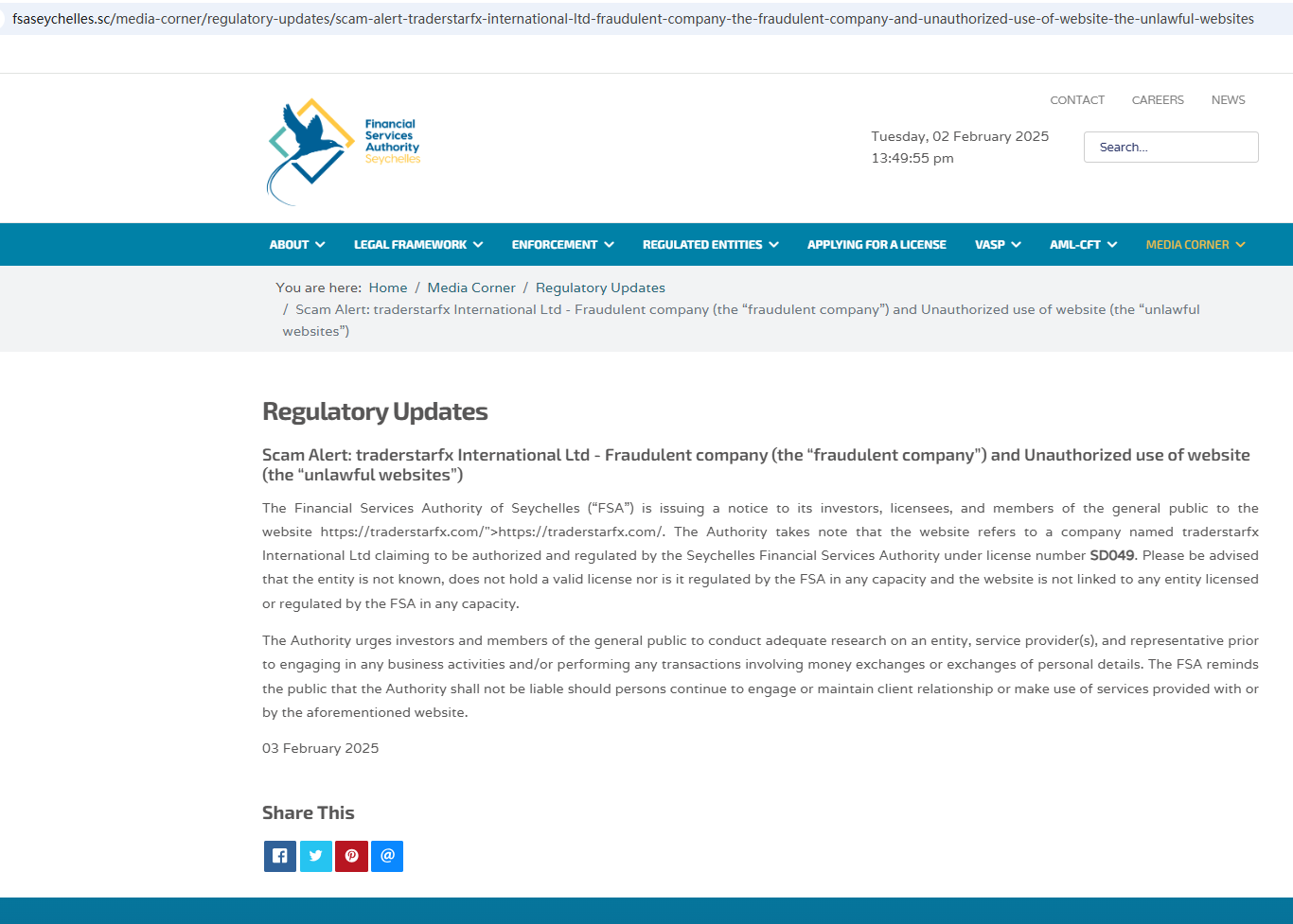 On February 3rd, 2025, the Seychelles Financial Services Authority (Seychelles FSA) issued a warning against traderstarfx for the lack of the required authorization. https://fsaseychelles.sc/media-corner/regulatory-updates/scam-alert-traderstarfx-international-ltd-fraudulent-company-the-fraudulent-company-and-unauthorized-use-of-website-the-unlawful-websites