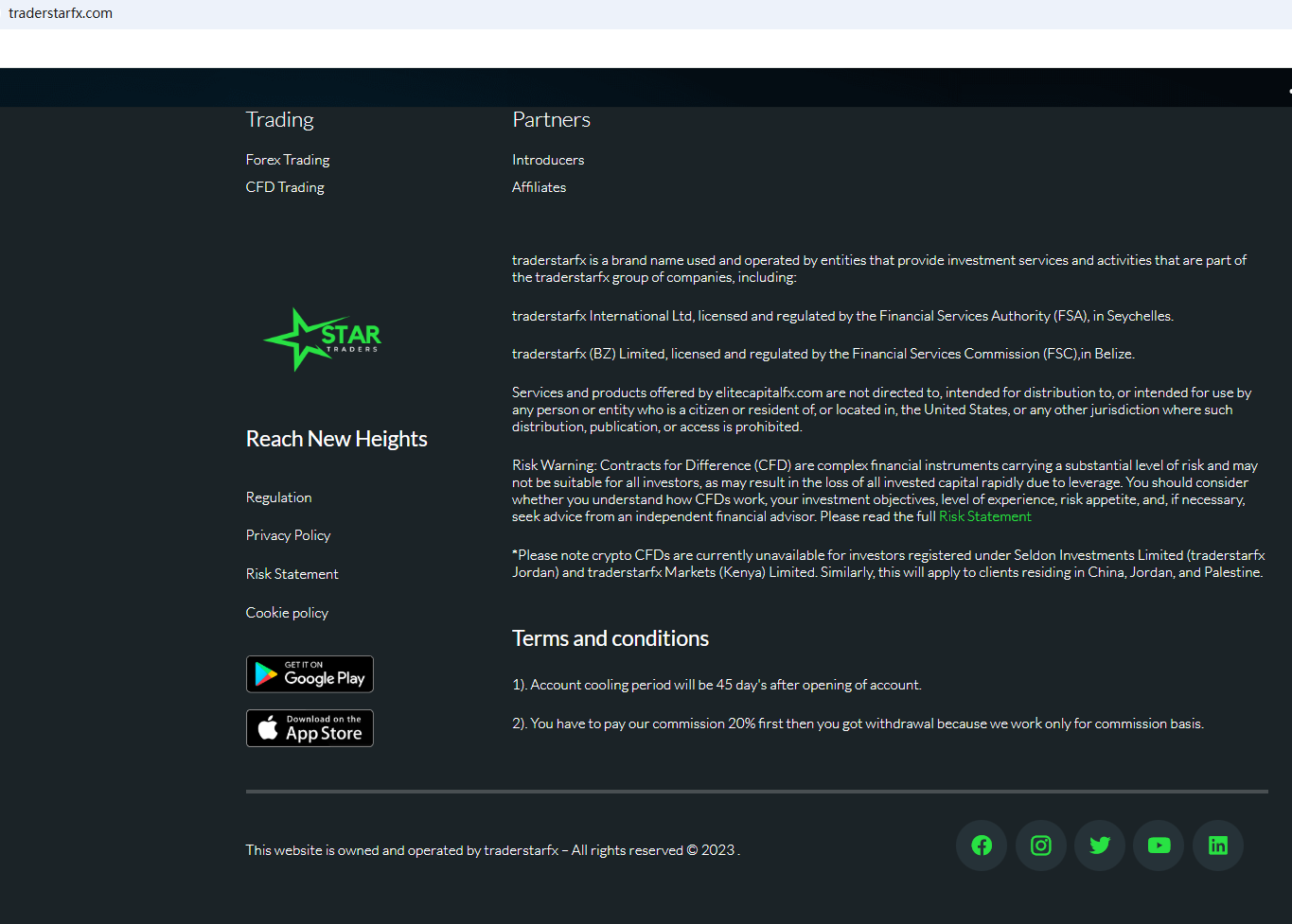 According to its website, it claims to be regulated by the Secheylles Financial Services Authority (Secheylles FSA) and Belize Financial Services Commission (Belize FSC). Upon investigation, no matching information was found in the Belize FSC. We found that the Seychelles Financial Services Authority (Seychelles FSA) warned against traderstarfx for lacking the required authorization.