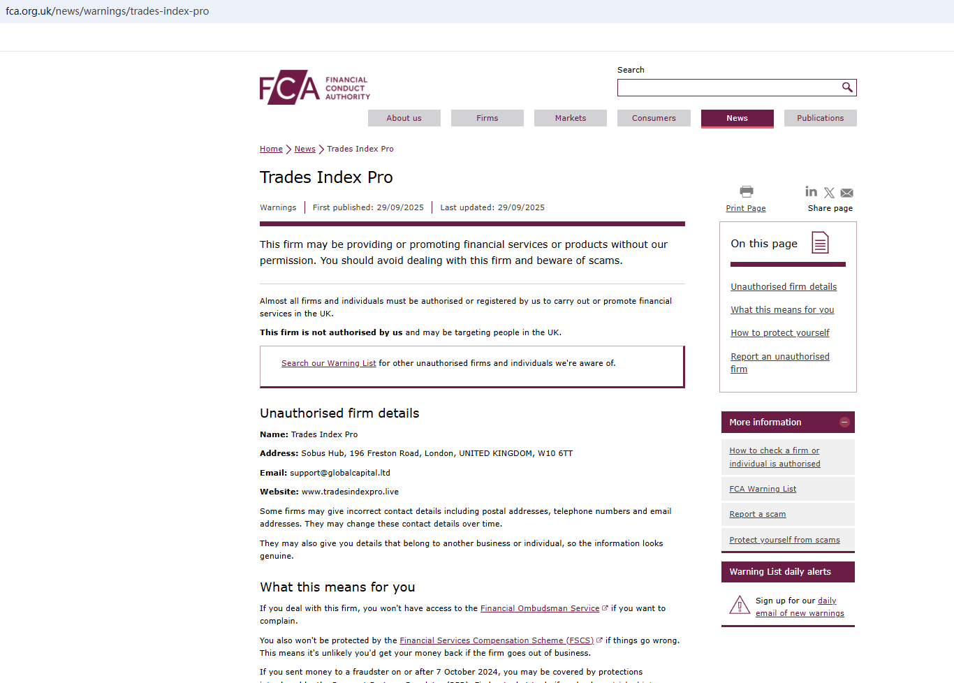 On September 26, 2025, the Financial Conduct Authority (FCA) issued a warning regarding Trades Index Pro, suspecting that this company may be offering financial services or products without the necessary authorization. https://www.fca.org.uk/news/warnings/trades-index-pro