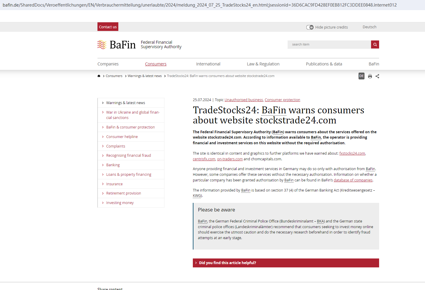 In addition, the Federal Financial Supervisory Authority (BaFin) warned consumers about the services offered on the website stockstrade24.com for lacking the required authorization.