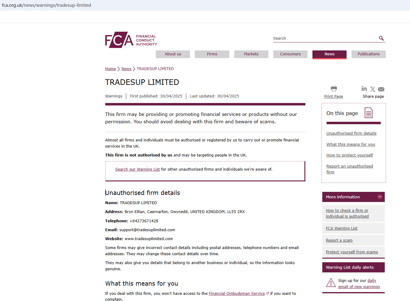 On April 30, 2025, the Financial Conduct Authority (FCA) issued a warning against TRADESUP LIMITED, believing this company might be providing financial services or products without proper authorization in the UK. https://www.fca.org.uk/news/warnings/tradesup-limited