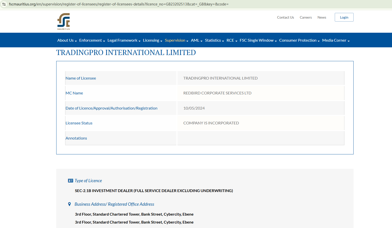 However, the Vanuatu license number doesn't exist. While corresponding records were found on the registers of the Financial Services Authority (SVG FSA) and the Mauritius FSC, the SVG FSA does not license or regulate forex trading brokerage activities. Additionally, the Mauritius FSC does not provide adequate company information for verification, including the associated website address. This makes it unclear if TradingPro is truly operating under the supposed Mauritius license.