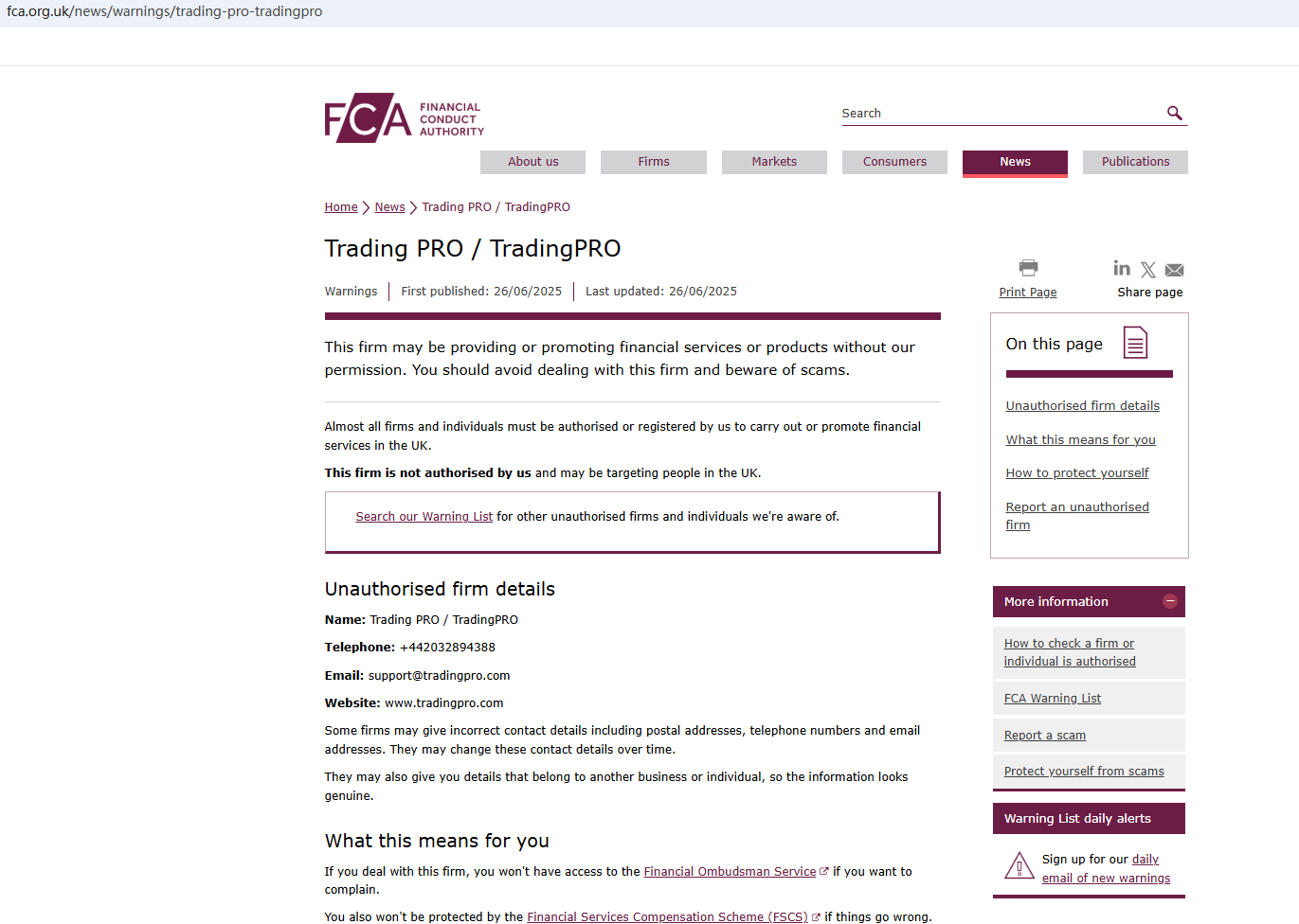 On Jun 24, 2025, the Financial Conduct Authority (FCA) issued a warning against TradingPro, believing this company might be providing financial services or products without proper authorization in the UK. https://www.fca.org.uk/news/warnings/trading-pro-tradingpro