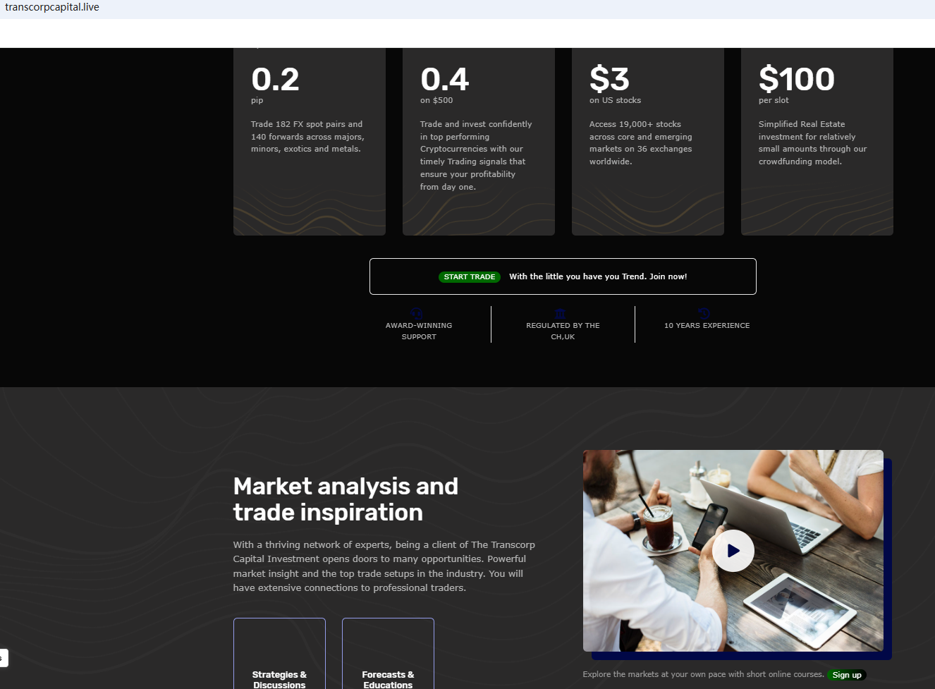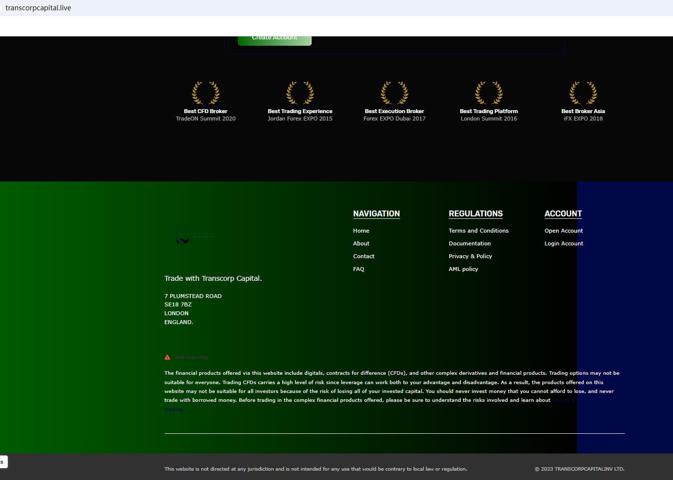 The website uses a common template for scam websites and has been flagged by Brokersview many times before. On the website, it claims to be regulated by Companies House (CH) but does not display any other valid regulatory information. As we all know, CH is only a company registration agency and does not have the right to regulate foreign exchange. What's more, the Financial Conduct Authority (FCA) issued a warning against TRANSCORP CAPITAL INVESTMENTS for the lack of the required authorization.