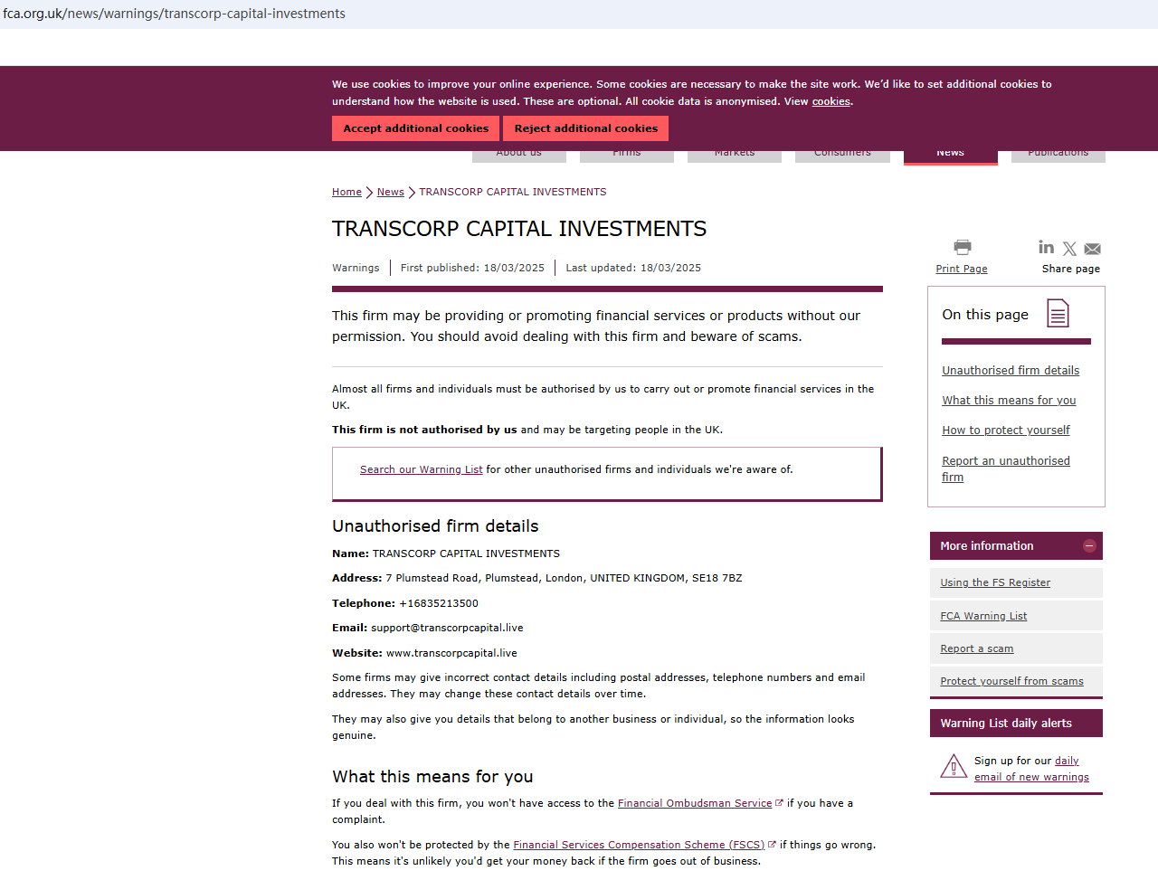 On March 18, 2025, the Financial Conduct Authority (FCA) issued a warning against TRANSCORP CAPITAL INVESTMENTS for the lack of the required authorization. https://www.fca.org.uk/news/warnings/transcorp-capital-investments