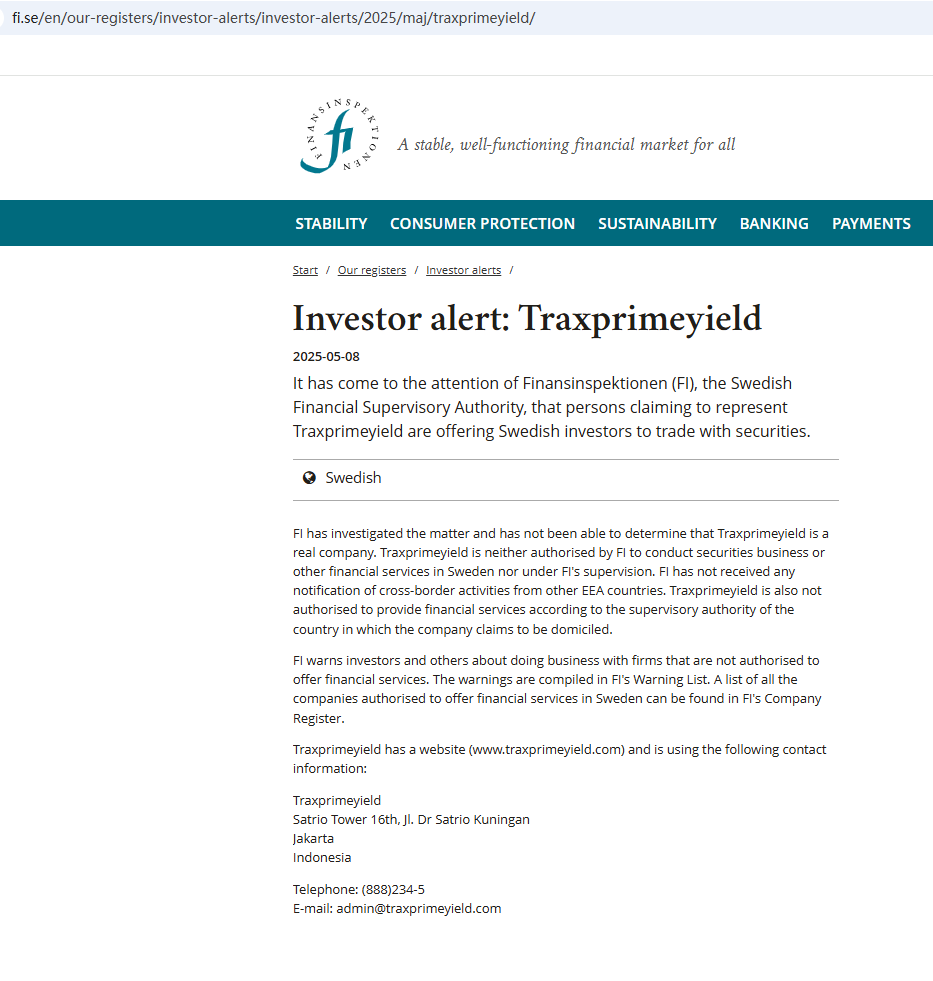 In addition, the Finansinspektionen (FI) issued a warning against Traxprimeyield, suspecting that it is not a real company.