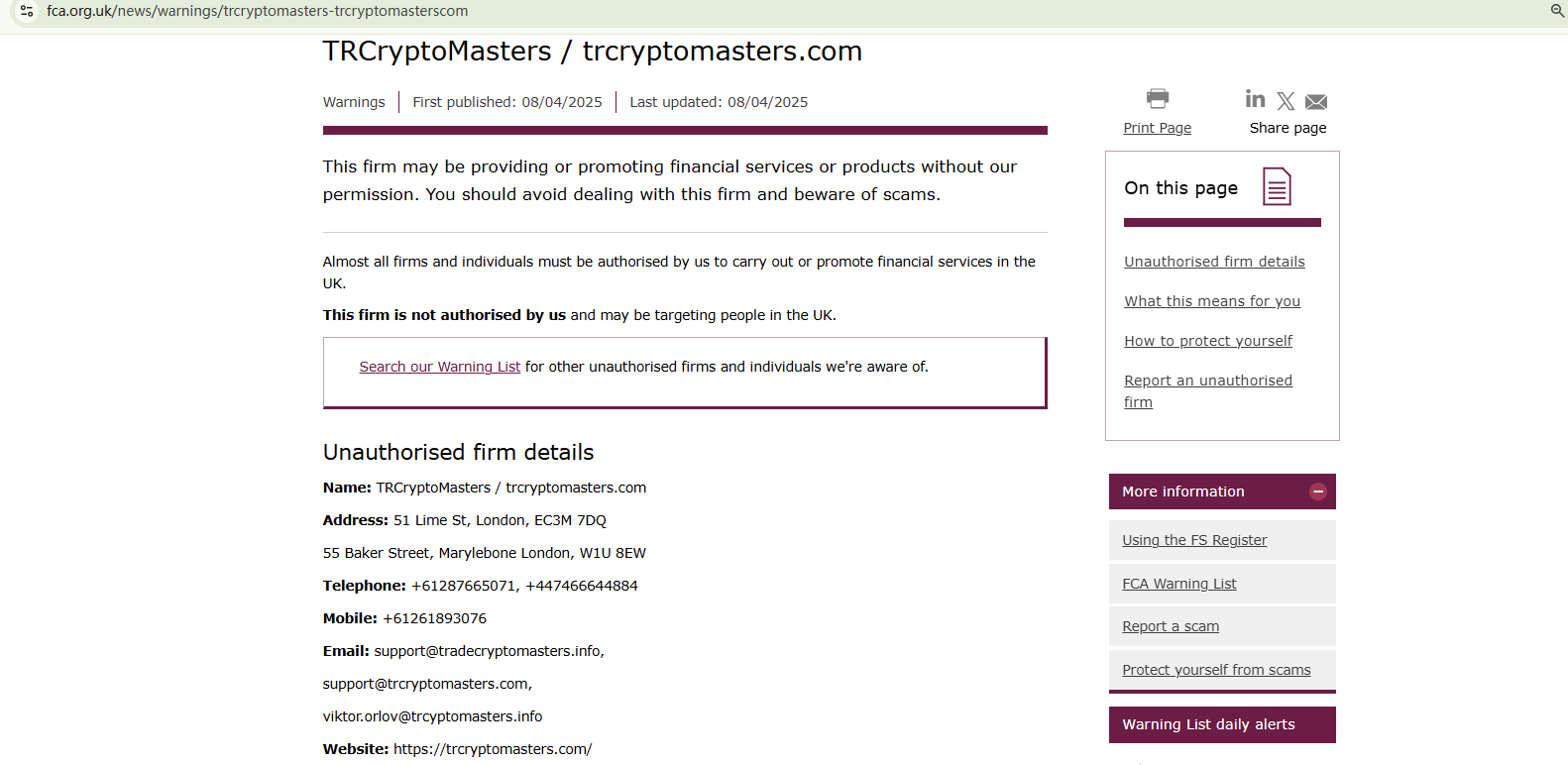 On April 8, 2025, the Financial Conduct Authority (FCA) issued a warning against TRCryptoMasters, believing this company might be providing financial services or products without proper authorization in the UK. https://www.fca.org.uk/news/warnings/trcryptomasters-trcryptomasterscom