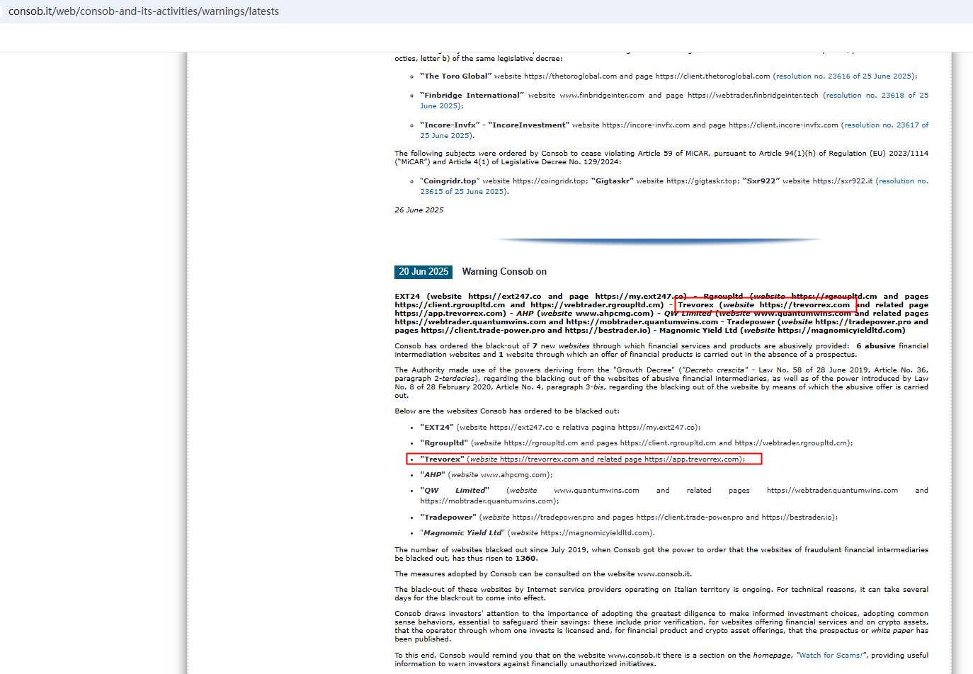 On Jun 20, 2025, the Italian Companies and Exchange Commission (CONSOB) has ordered Trevirex's website to be blacked out since it offers financial services illegally. https://www.consob.it/web/consob-and-its-activities/warnings/latests