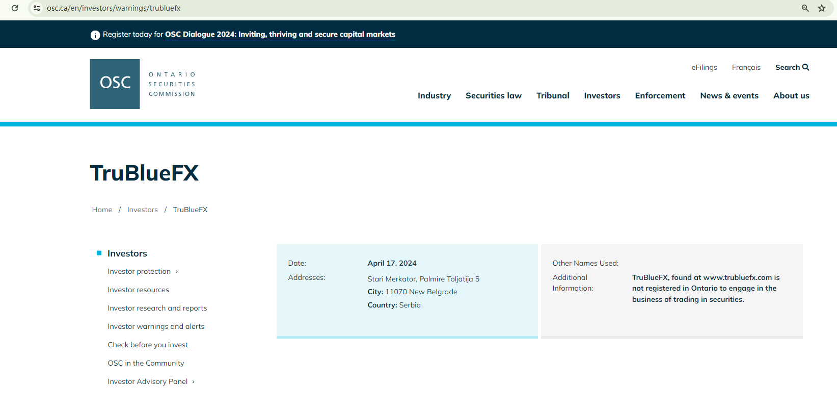 On April 17, 2024, the Ontario Securities Commission (OSC) issued a warning against TruBlueFX, stating that this broker is not registered in Ontario to engage in the business of trading in securities. https://www.osc.ca/en/investors/warnings/trubluefx
