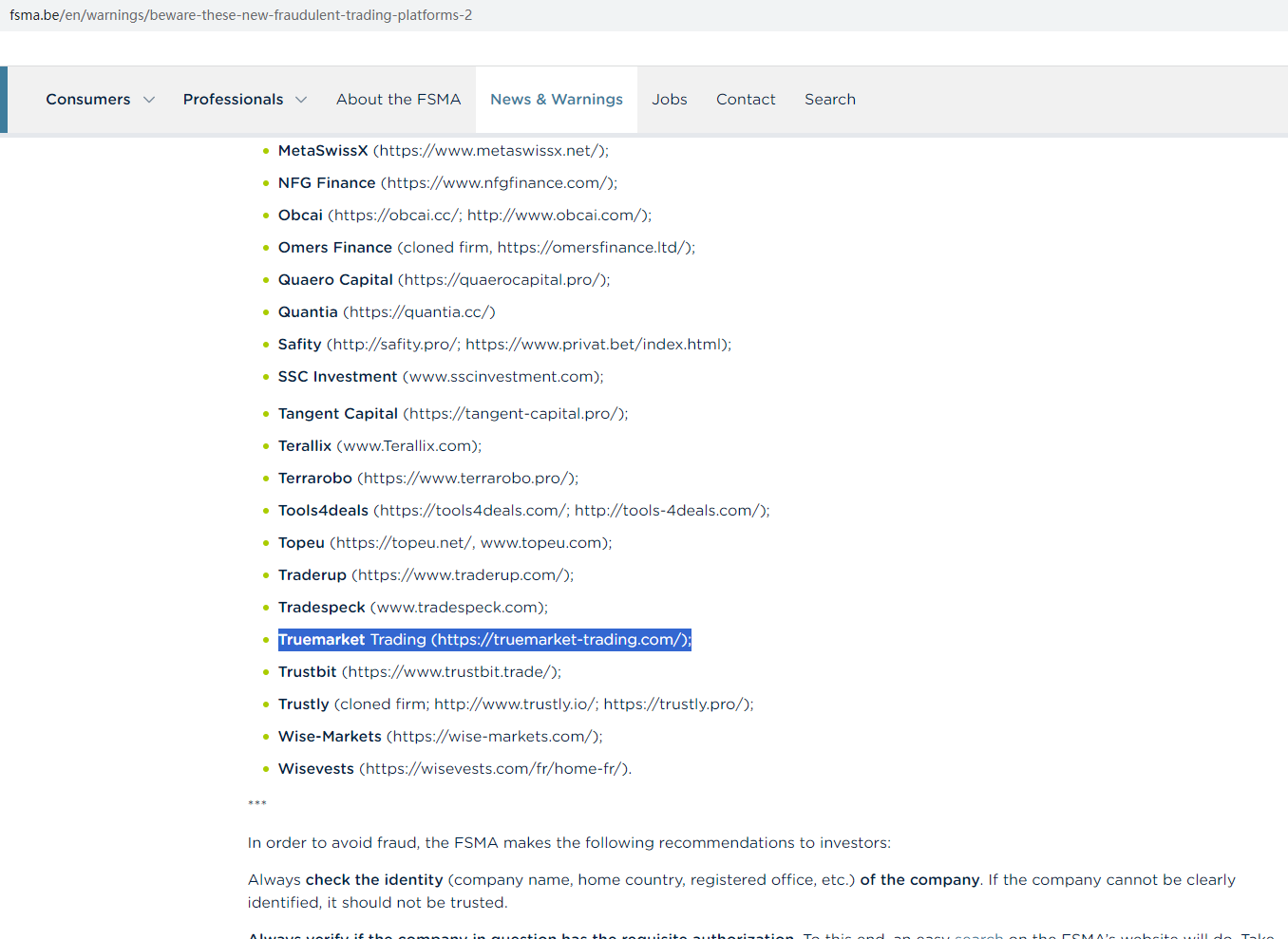On November 30, 2023, the Belgian Financial Services and Markets Authority (FSMA) added Truemarket Trading to its warning list as a fraudulent trading platform operating in the Belgian market. https://www.fsma.be/en/warnings/beware-these-new-fraudulent-trading-platforms-2