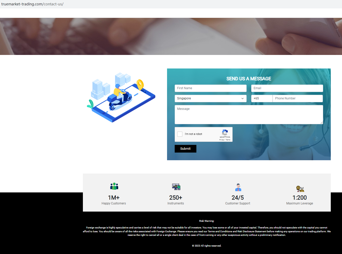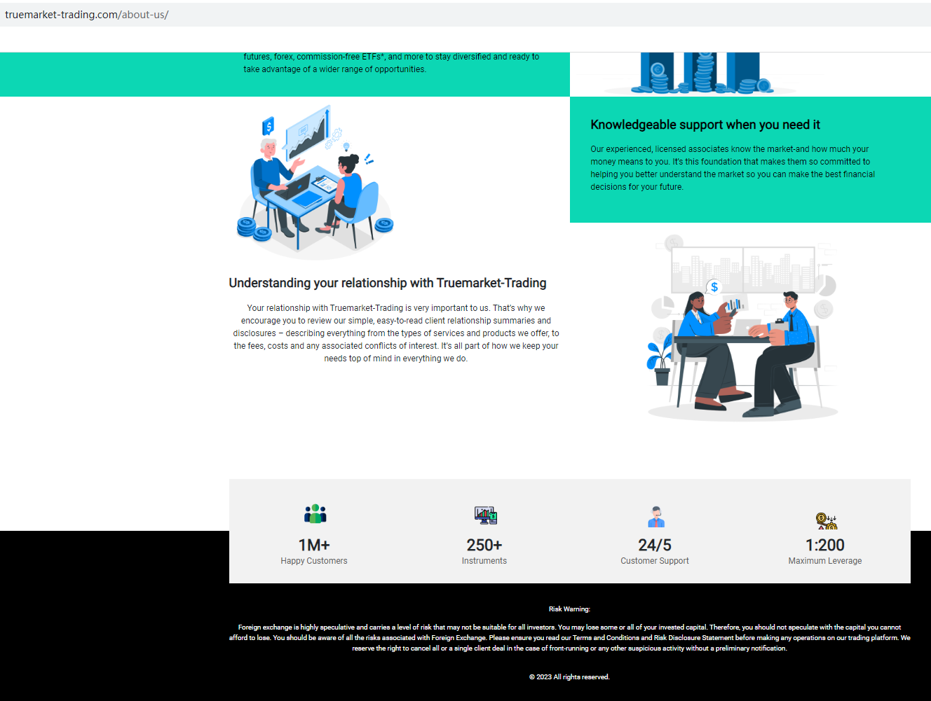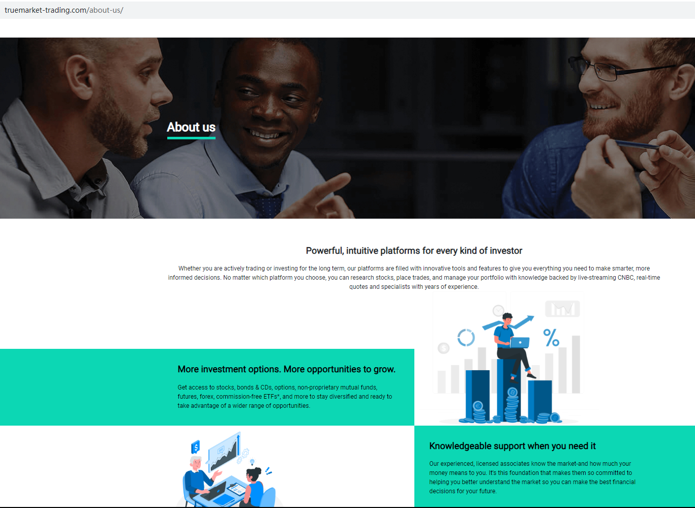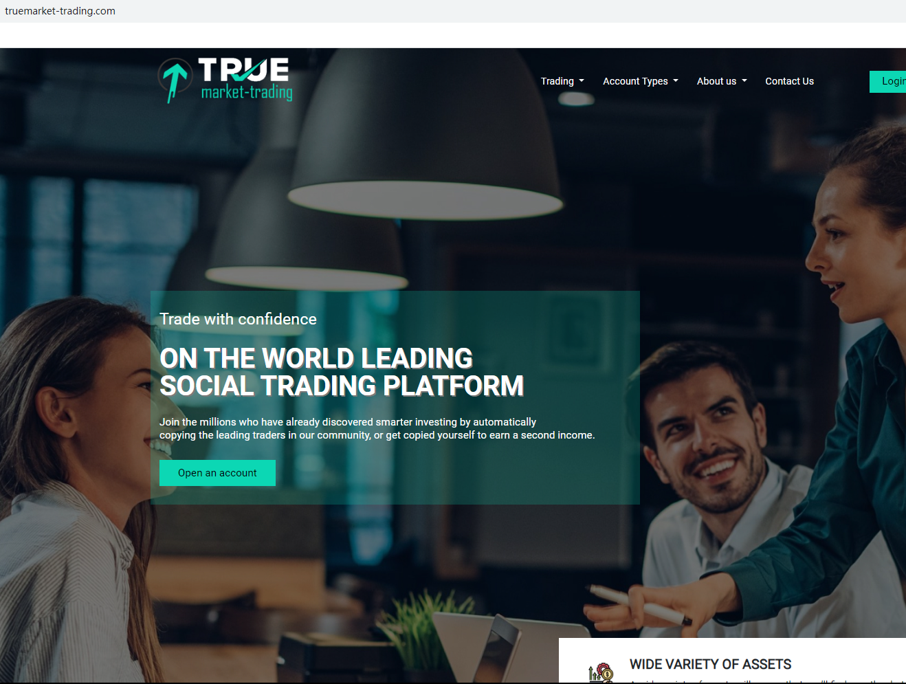 Truemarket Trading claims to be a reliable company without presenting any information about its regulation or contact. The lack of such important information may be a distinct signal of an unlicensed broker, as regulated companies always present their accreditations and licenses in a prominent position. It is a red flag.