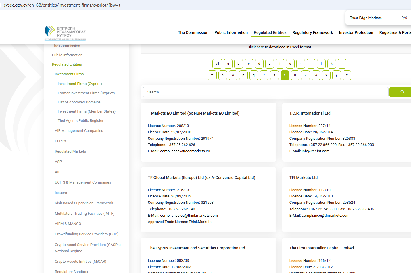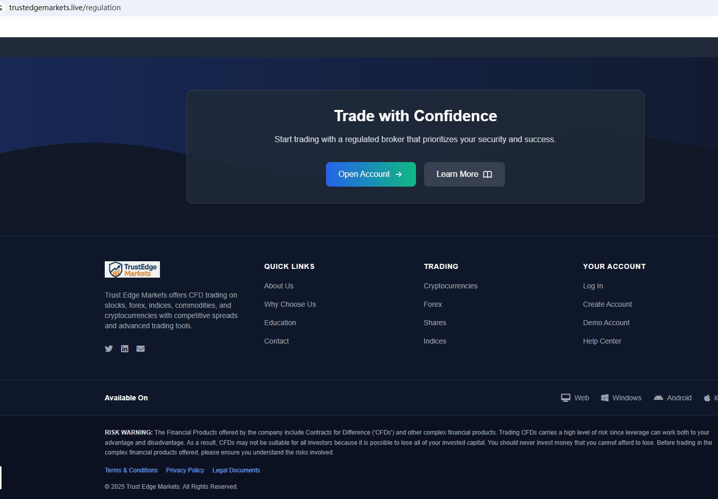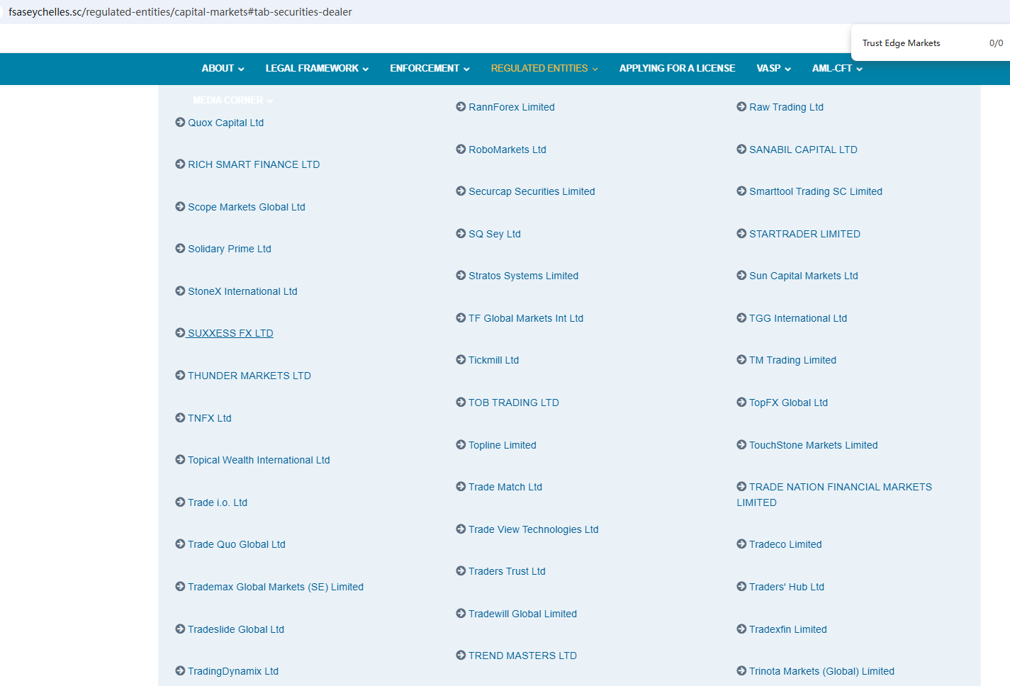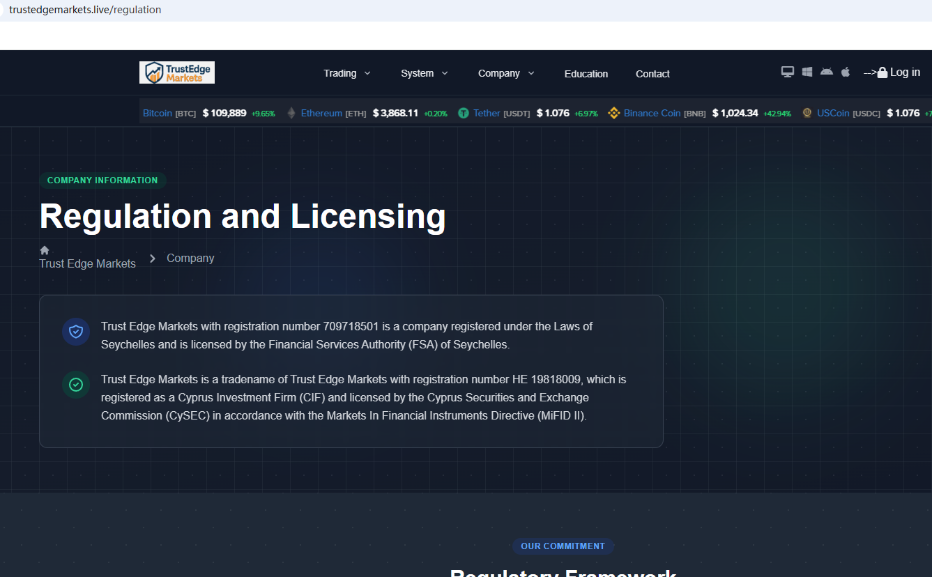 According to its website, it claims to be regulated by the Seychelles Financial Services Authority (Seychelles FSA) and the Cyprus Securities and Exchange Commission (CySEC). Upon investigation, no matching information was found in the Seychelles FSA and CySEC. In addition, the Financial Conduct Authority (FCA) issued a warning regarding Trust Edge Markets, suspecting that this company may be offering financial services or products without the necessary authorization.