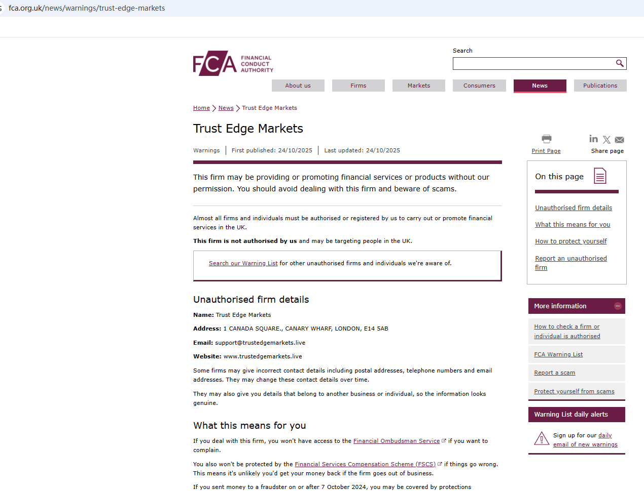 On Oct 24, 2025, the Financial Conduct Authority (FCA) issued a warning regarding Trust Edge Markets, suspecting that this company may be offering financial services or products without the necessary authorization. https://www.fca.org.uk/news/warnings/trust-edge-markets