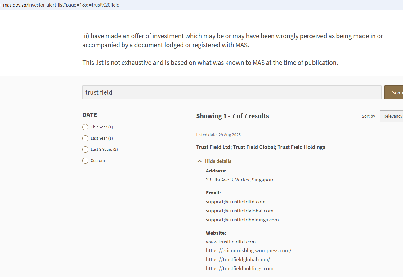 On Aug 29, 2025, the Monetary Authority of Singapore (MAS) added Trust Field to its warning list for providing investment services without being licensed. https://www.mas.gov.sg/investor-alert-list?page=1&q=trust%20field