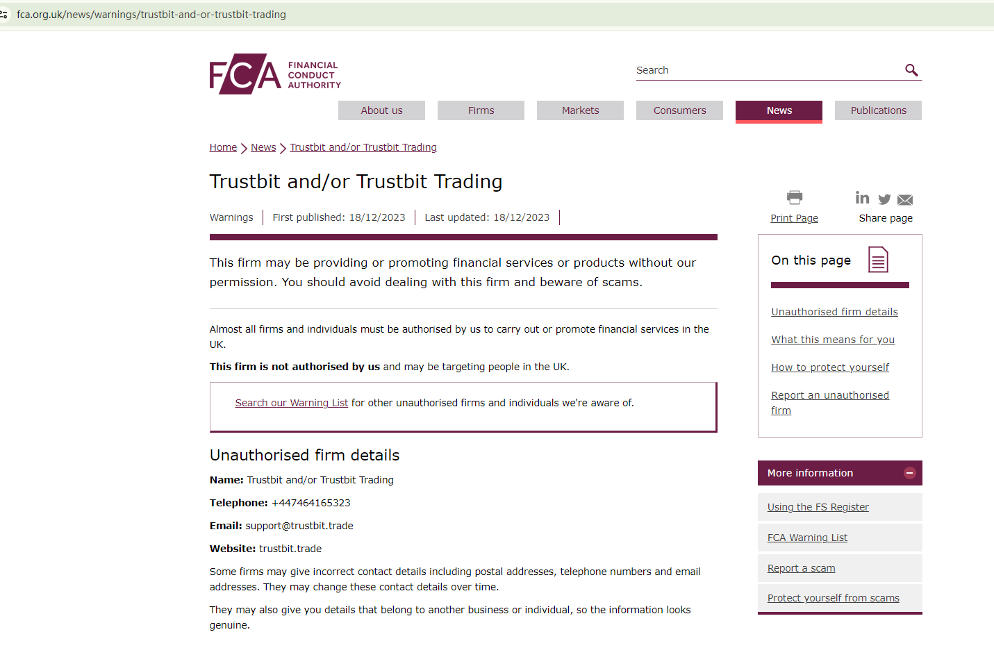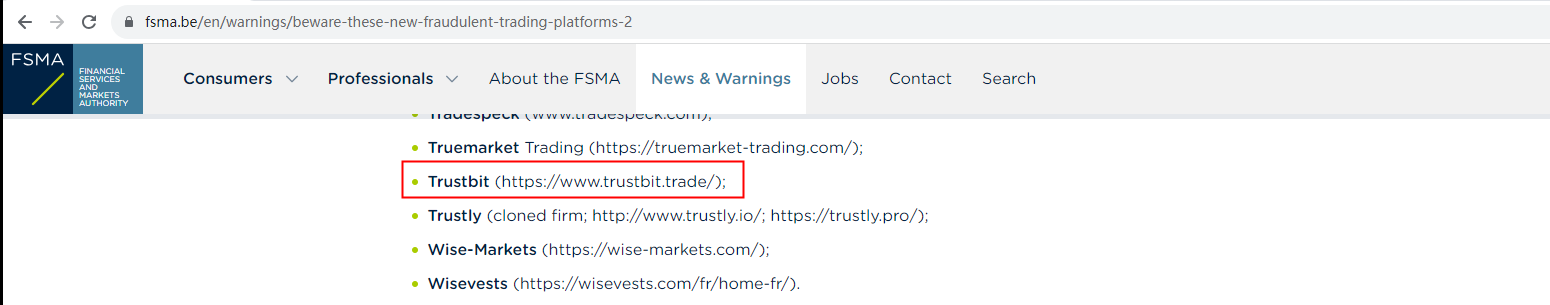On 30 November 2023, the Financial Services and Markets Authority (FSMA) issued a warning that Trustbit was providing financial services or products without authorisation. You may visit: https://www.fsma.be/en/warnings/beware-these-new-fraudulent-trading-platforms-2