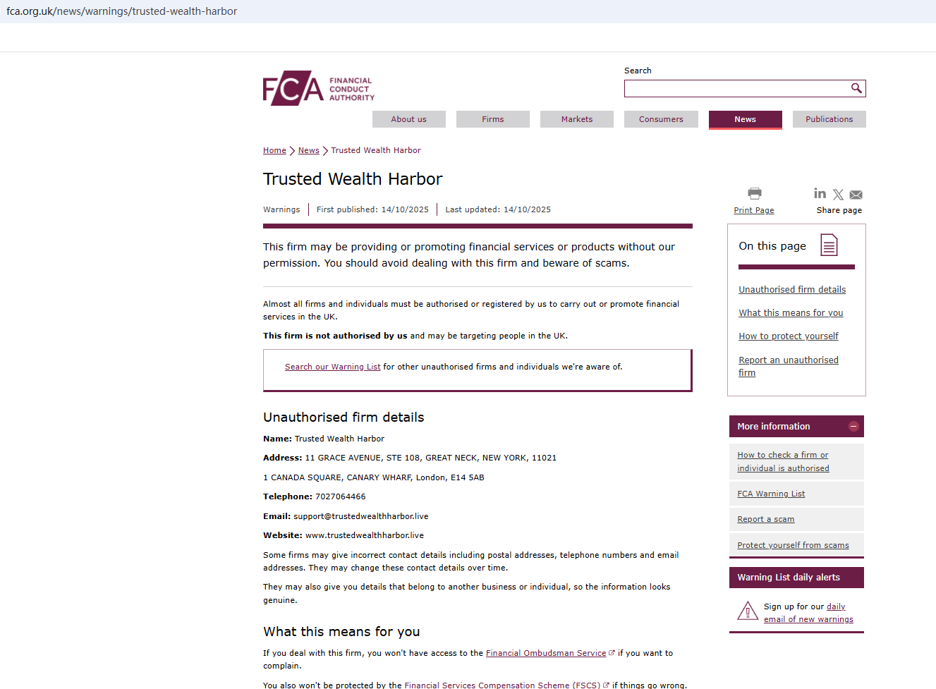 On Oct 14, 2025, the Financial Conduct Authority (FCA) issued a warning regarding Trusted Wealth Harbor, suspecting that this company may be offering financial services or products without the necessary authorization. https://www.fca.org.uk/news/warnings/trusted-wealth-harbor