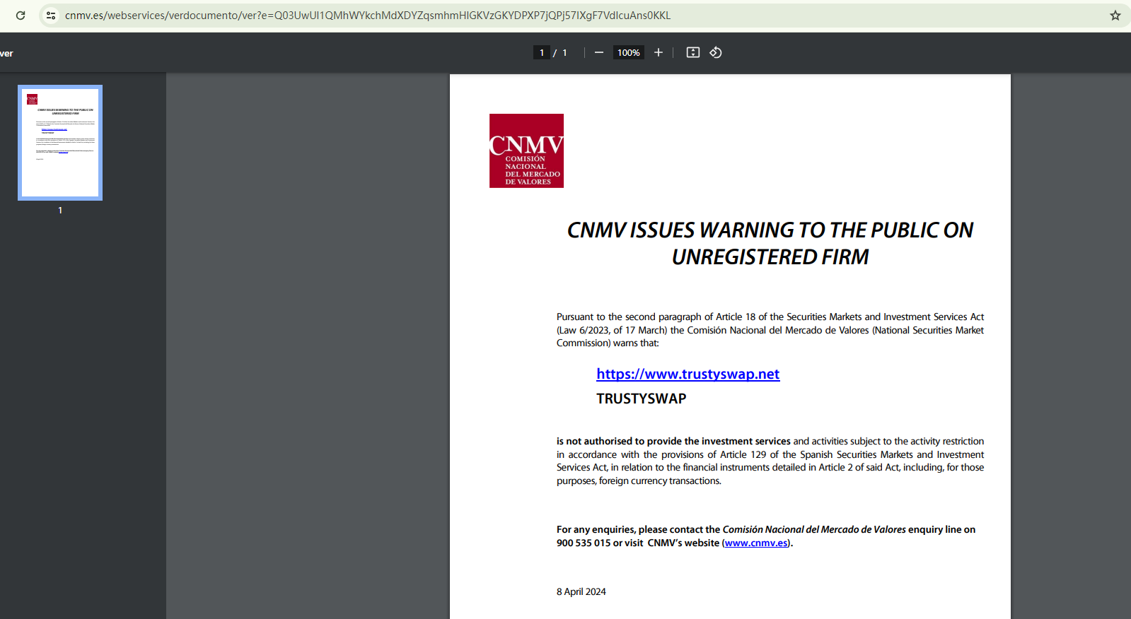 On April 8, 2024, the Comisión Nacional del Mercado de Valores (CNMV) added Trustyswap to its warning list for providing investment services without authorization. https://www.cnmv.es/portal/ResultadoBusqueda.aspx?tipo=1&nombre=TRUSTYSWAP