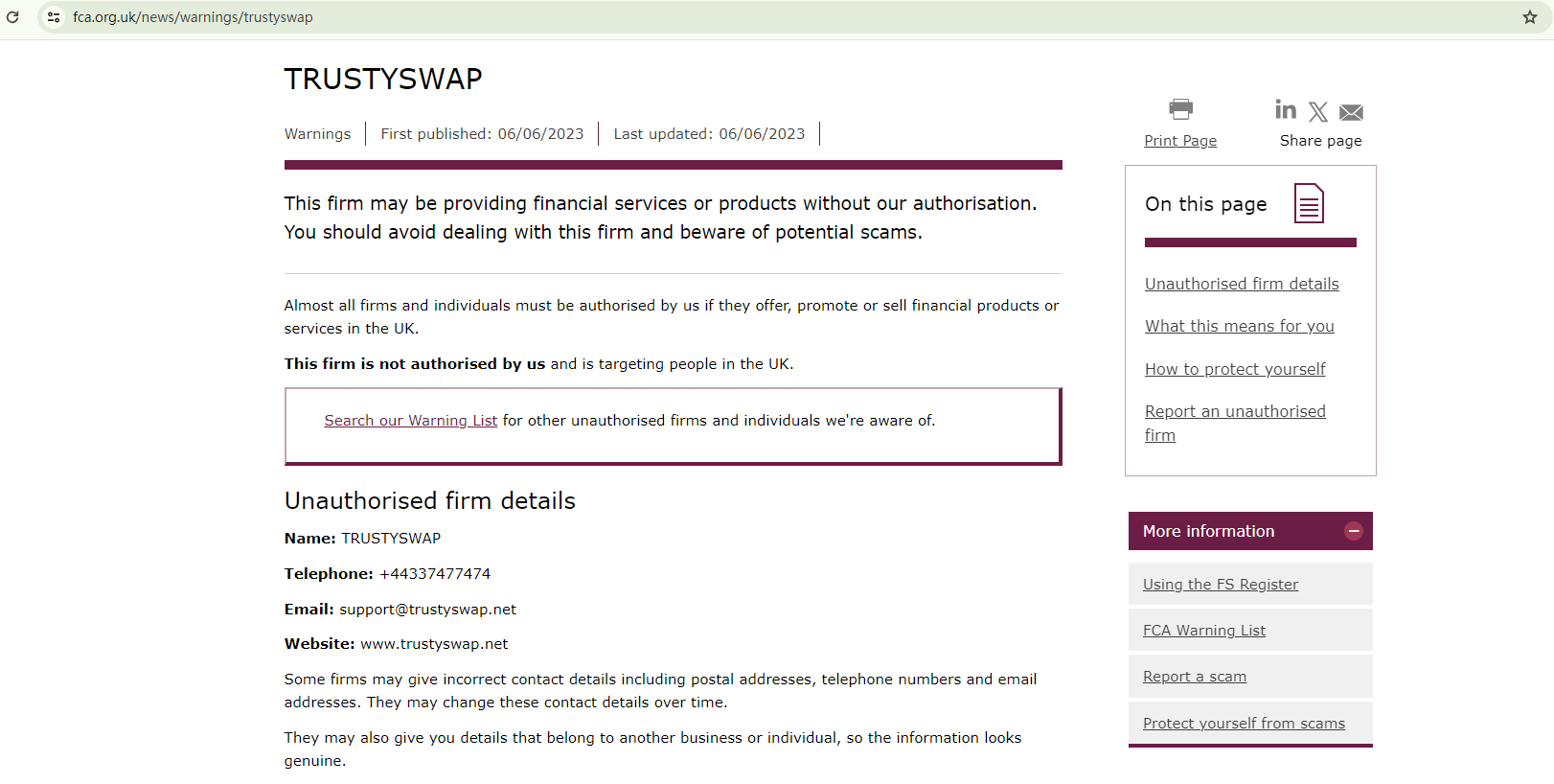 On June 6, 2023, the Financial Conduct Authority (FCA) issued a warning against Trustyswap, believing this company might be providing financial services or products without proper authorization in the UK. https://www.fca.org.uk/news/warnings/trustyswap