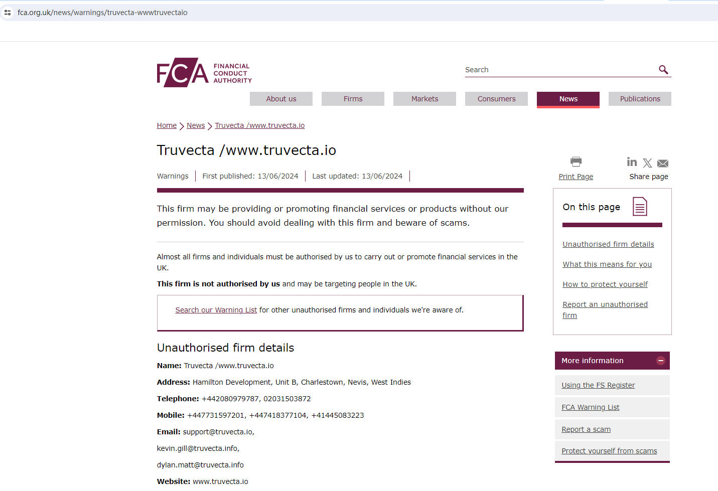 As Truvecta has created more avenues to illegally solicit investors, the Financial Conduct Authority (FCA) has updated its warning against the unauthorized entity to inform investors about the situation and advise them to stay away from the scam. https://www.fca.org.uk/news/warnings/truvecta-wwwtruvectaio