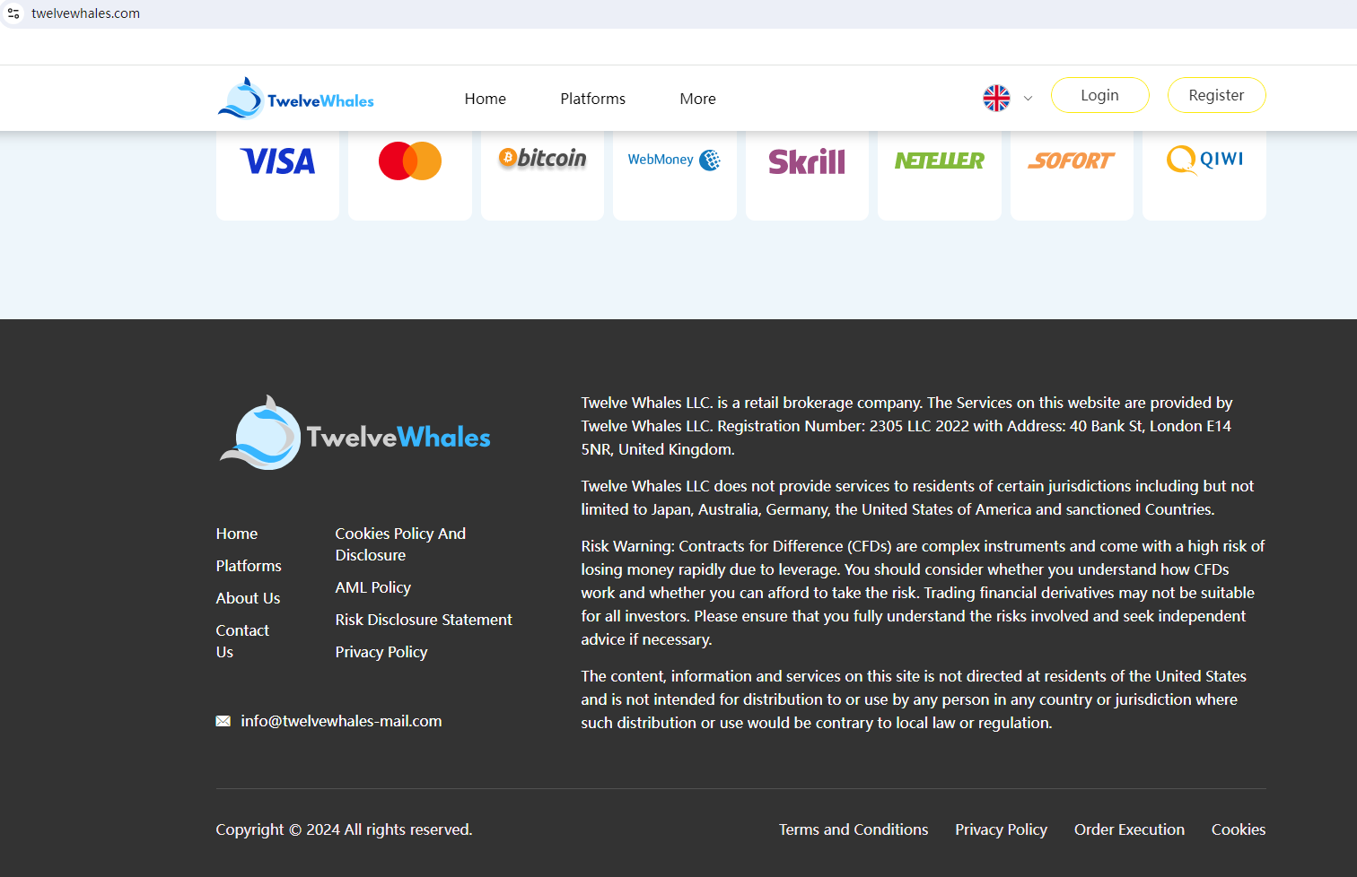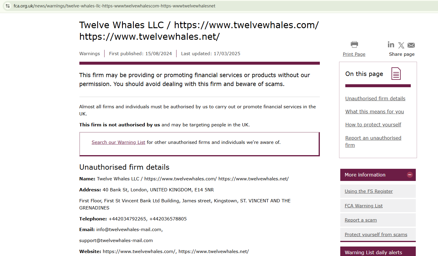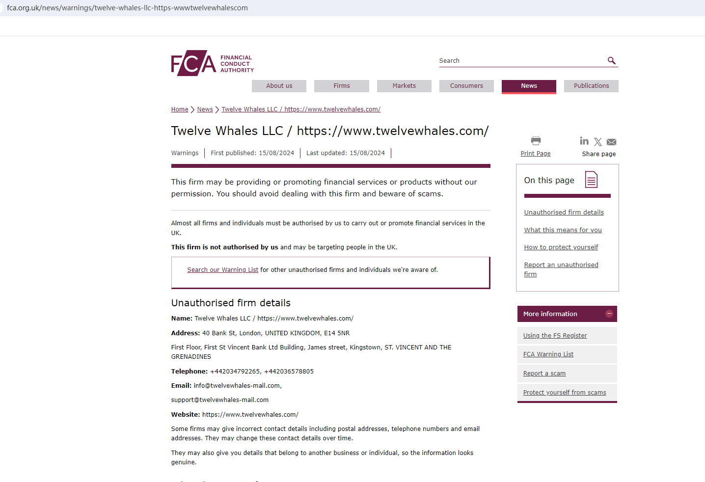 On 15 Aug, 2024, the Financial Conduct Authority (FCA) issued a warning against Twelve Whales, believing this company might be providing financial services or products without proper authorization in the UK. https://www.fca.org.uk/news/warnings/twelve-whales-llc-https-wwwtwelvewhalescom