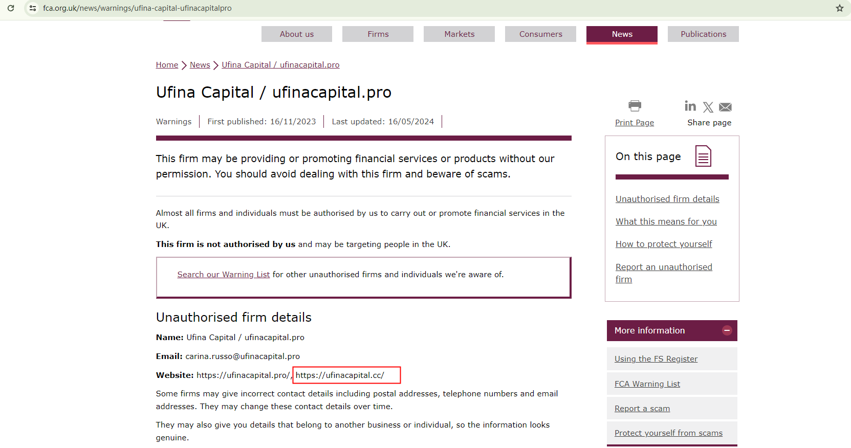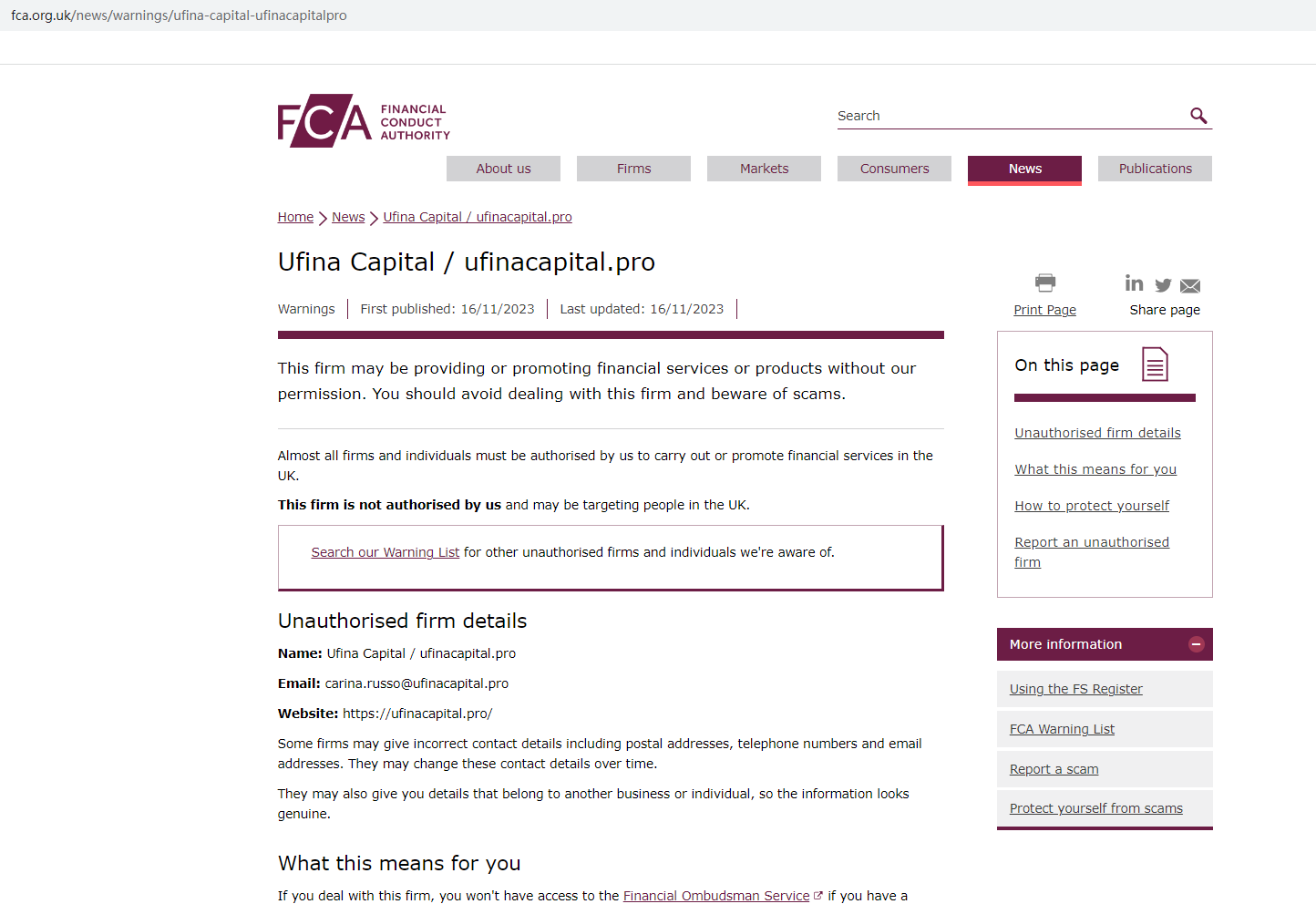 On 16 November 2023, the United Kingdom Financial Conduct Authority (UK FCA) issued a warning that Ufina Capital was providing financial services or products in the UK without authorisation. You may visit: https://www.fca.org.uk/news/warnings/ufina-capital-ufinacapitalpro