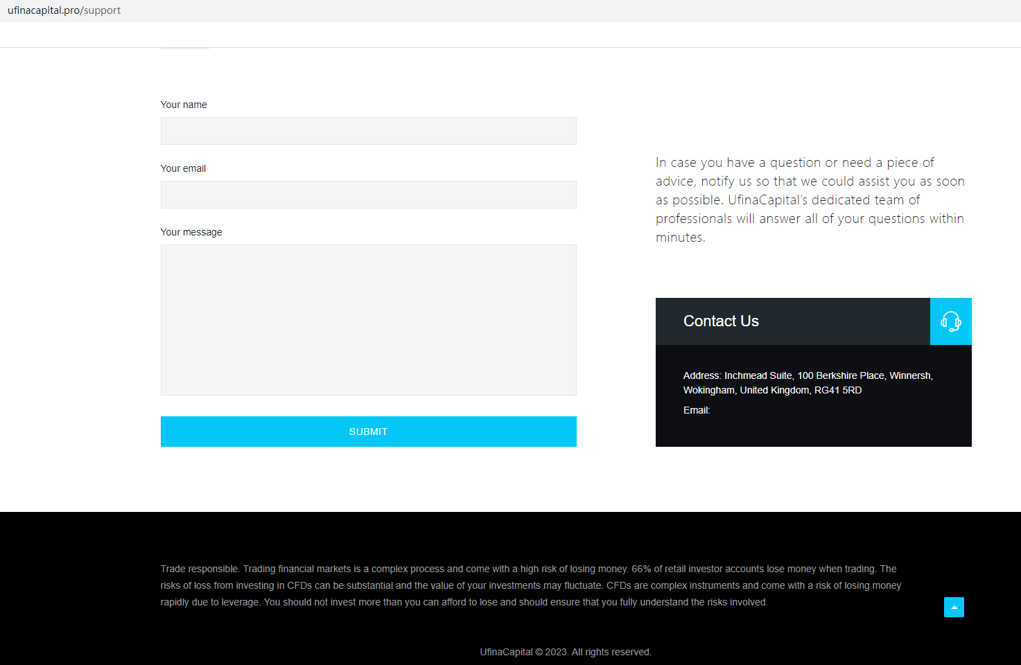According to its website, Ufina Capital is located in the UK, but upon investigation, we found that the United Kingdom Financial Conduct Authority (UK FCA) issued a warning that Ufina Capital was providing financial services or products without authorisation.