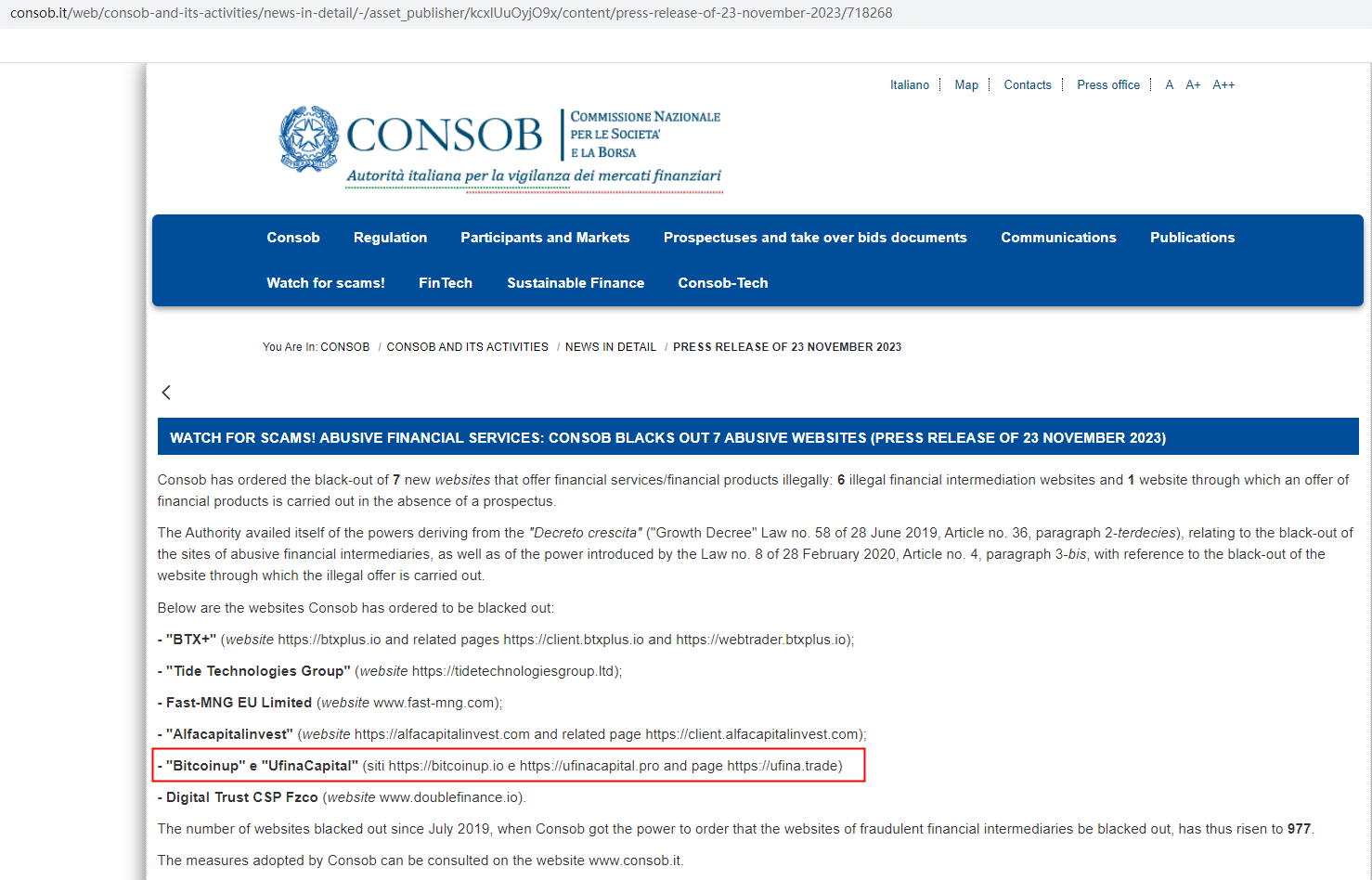 Ufina Capital is still in business, continuing its fraudulent activities to steal money. Therefore, the CONSOB updates its warning against Ufina Capital, cautioning the public to stay away from this unauthorized firm. https://www.consob.it/web/consob-and-its-activities/news-in-detail/-/asset_publisher/kcxlUuOyjO9x/content/press-release-of-8-february-2024/718268