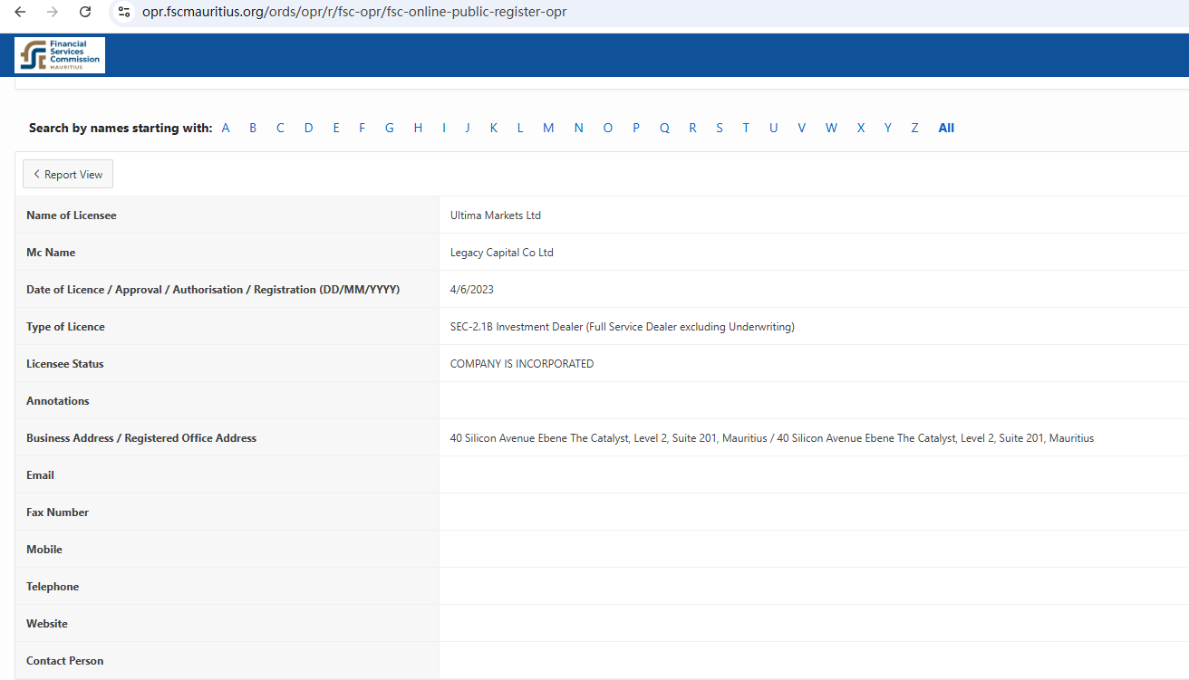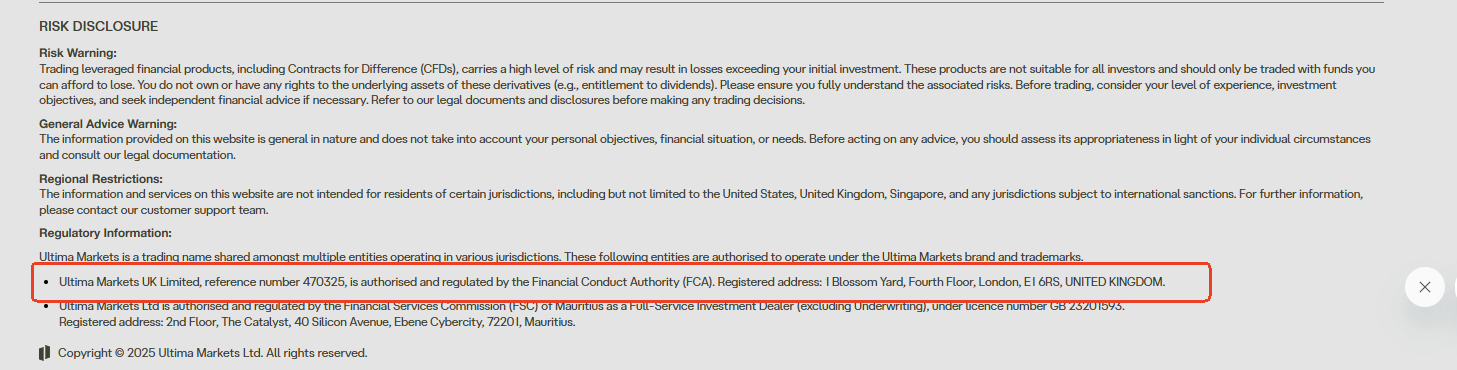 Ultima Markets claims to be regulated and licensed by both the UK Financial Conduct Authority (FCA) and the Financial Services Commission (FSC) of Mauritius. While we were able to locate license records associated with Ultima Markets in the databases of both regulatory bodies, significant concerns remain regarding the legitimacy of these claims.