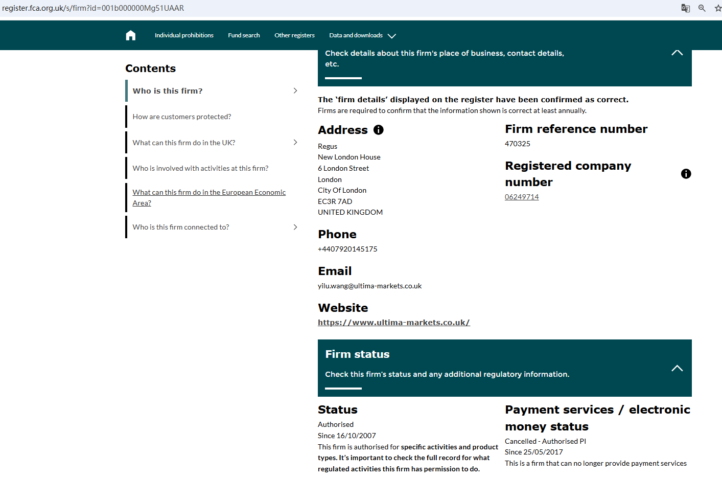Firstly, the website registered with the FCA does not match Ultima Markets’ official platform URL, making it impossible to verify the authenticity of the firm’s FCA registration.
