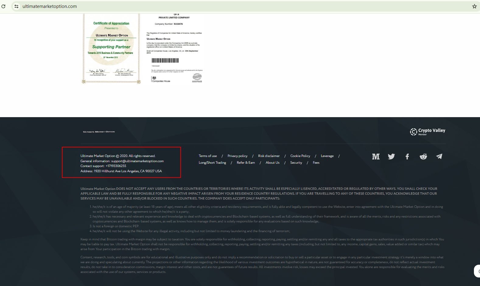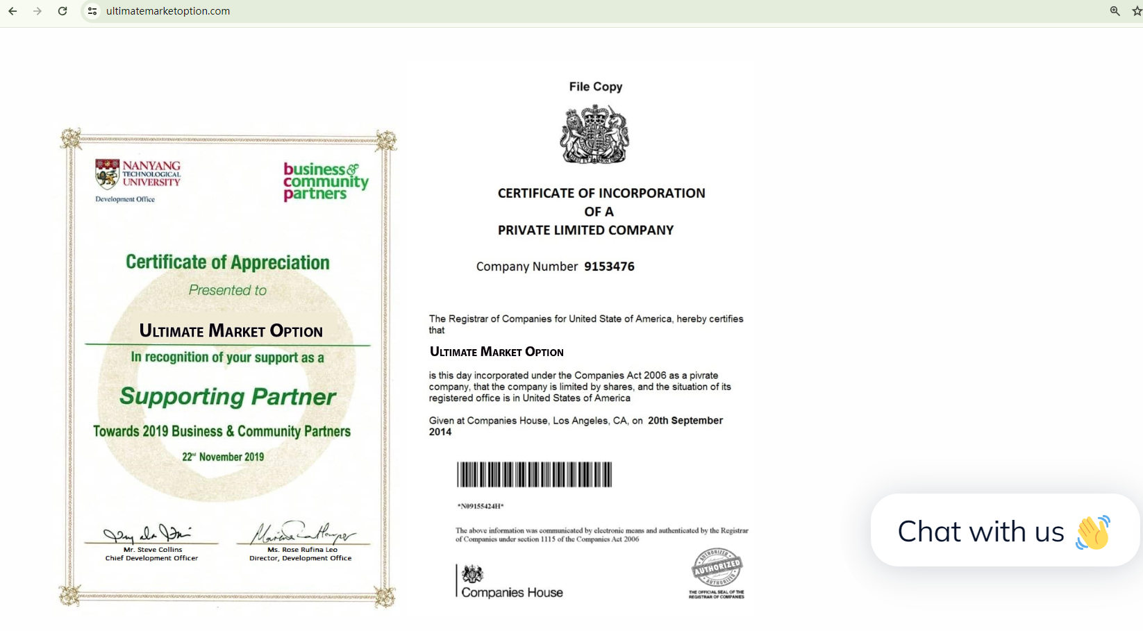 Ultimate Market Option showcases two certificates as evidence of its legitimacy. One purports a partnership with a university, which lacks credibility when it comes to online trading. The other appears to be a falsified Companies House (CH) license, with obvious signs of photoshopping and an incorrect assertion that the CH is in the US, despite the badge on it being associated with the UK. These findings serve as a warning sign for potential fraudulent activities.