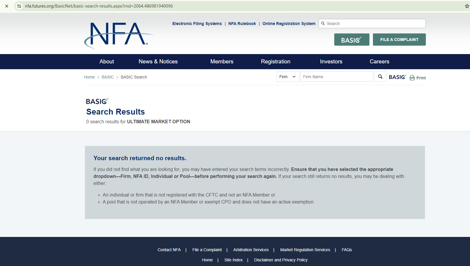 Although a US address is listed, there are no indications that Ultimate Market Option is registered as a member of the National Futures Association (NFA), and thus it is not subject to its oversight.
