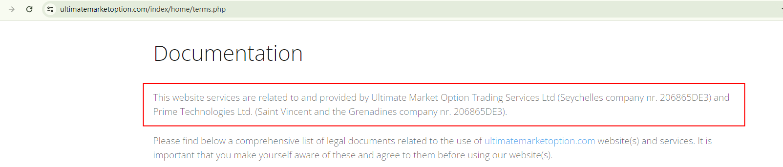 What's more, the broker's website claims that its operators, namely Ultimate Market Option Trading Services Ltd and Prime Technologies Ltd, are registered in Seychelles and the St. Vincent and the Grenadines respectively. However, our search for both companies yielded no matching results, suggesting this information is also fabricated.